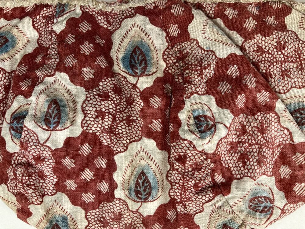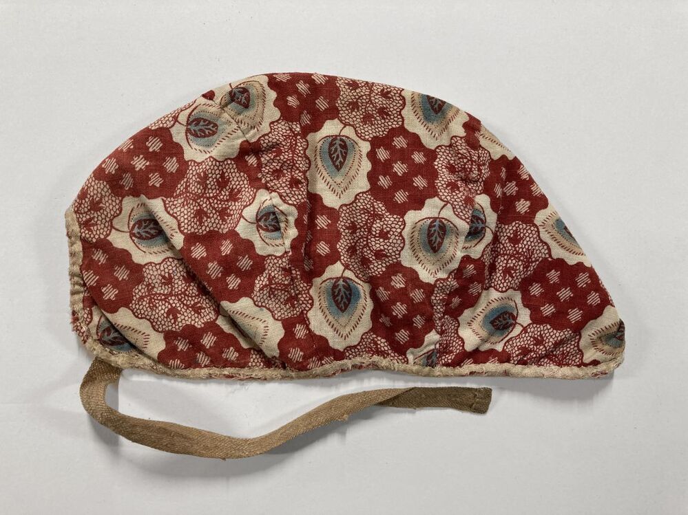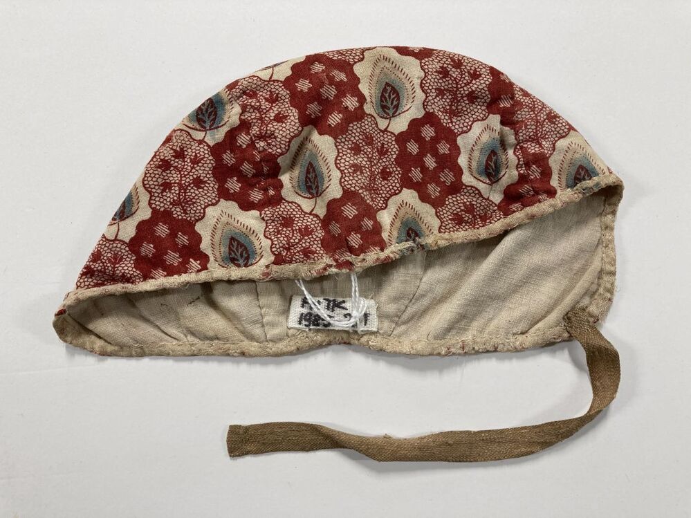 Meisjesmuts, bedrukt met gekartelde zeshoeken met diverse vullingen op witte grond