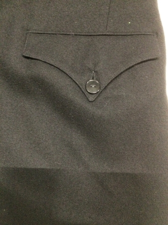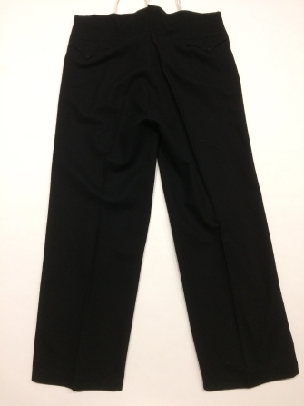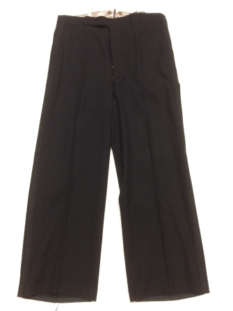 Zwarte lange broek van zwart laken met gulpsluiting afgezet met zwart glanzend galonband, onderdeel van mannenkostuum