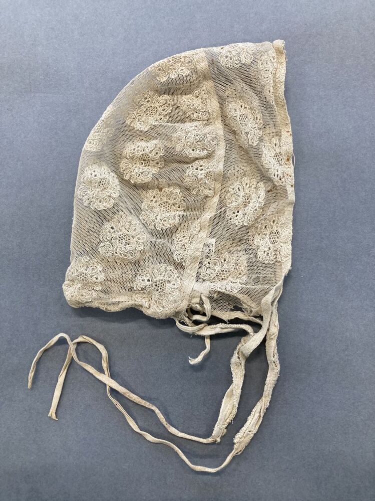 Niet Friese muts met slippen, tule doorstopwerk, samen met een mutsbol binnengekomen