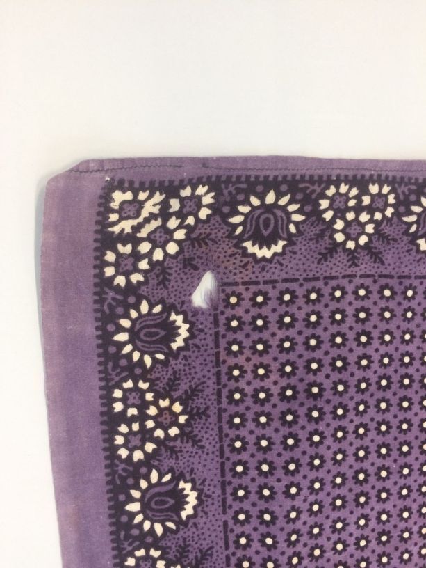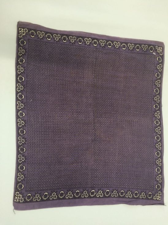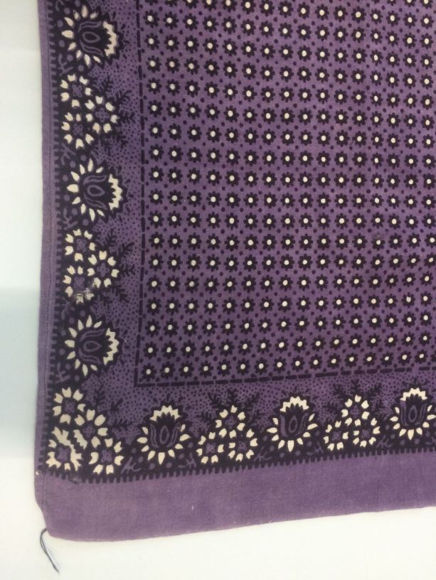Doek van bedrukt katoen in paars met uitgepaarde bloemmotieven in rand en stippen op middenveld.