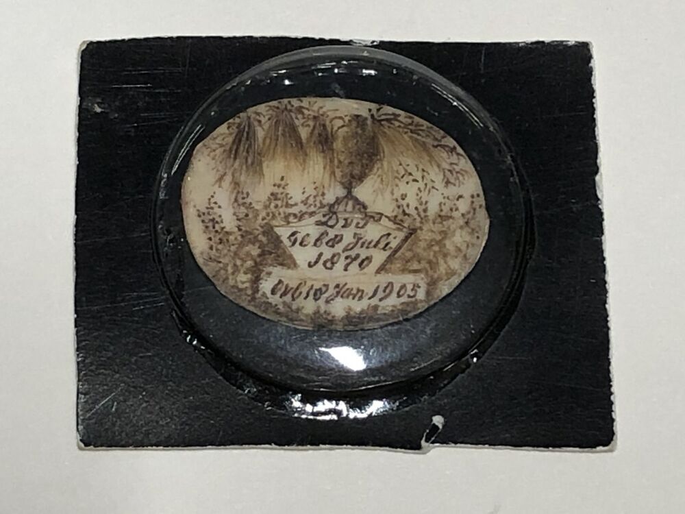 Haarwerk medaillonplaat van been, hierop een geplakt en geschilderde voorstelling van grafvaas of urn waar uit takken met haartoefjes