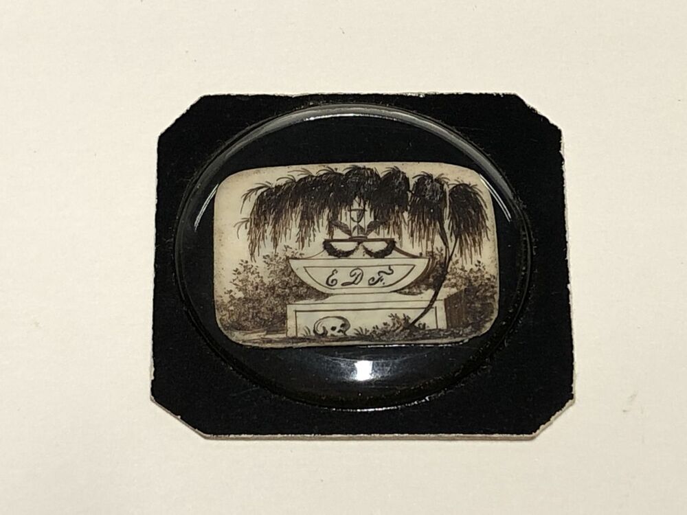 Medaillonplaatje van wit been, haarvoorstelling en schilderwerk in de vorm van een sarcofaag waarop een gevleugelde zandloper