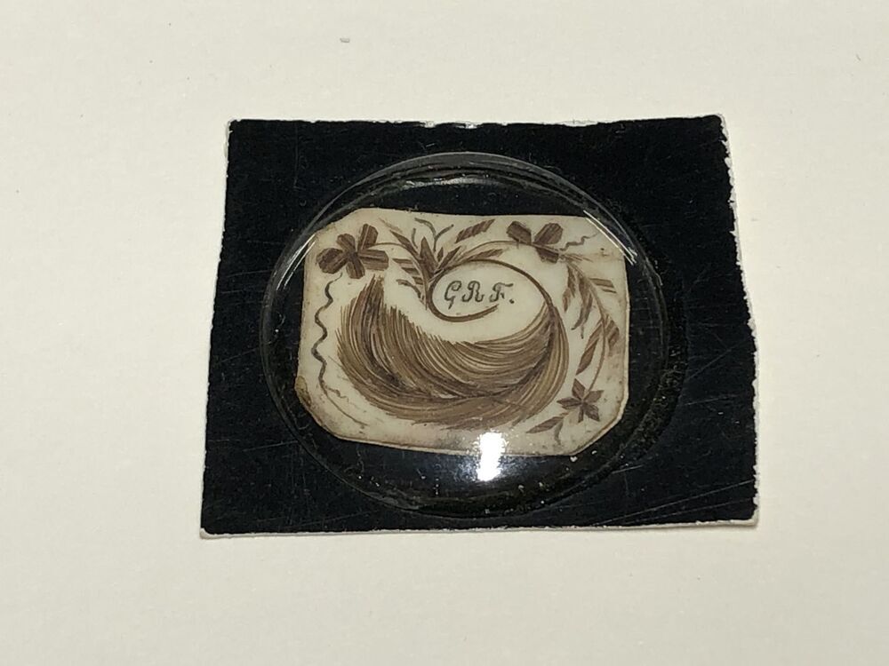 Medaillonplaat van wit been, hierop is haarwerk geplakt, een krullende veerblad met rondom kleine bloemetjes en blaadjes