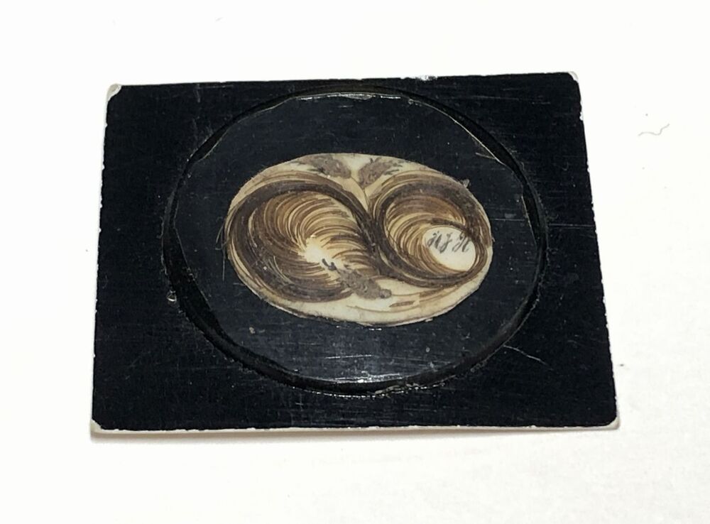 Medaillonplaat van wit been, beplakt met donker haar en beschilderd, een krullend veerachtig blad zich in 2 delen splitsend