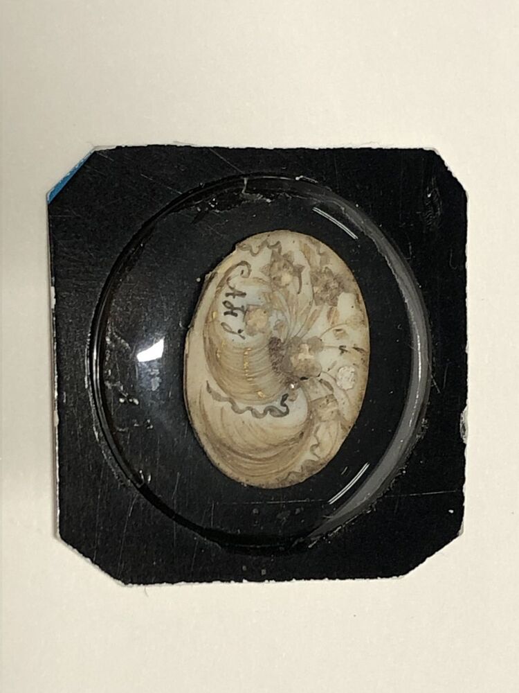 Medaillonplaat waarop een voorstelling van geplakt haar en schilderwerk, een hoorn van overvloed waaruit bloemen