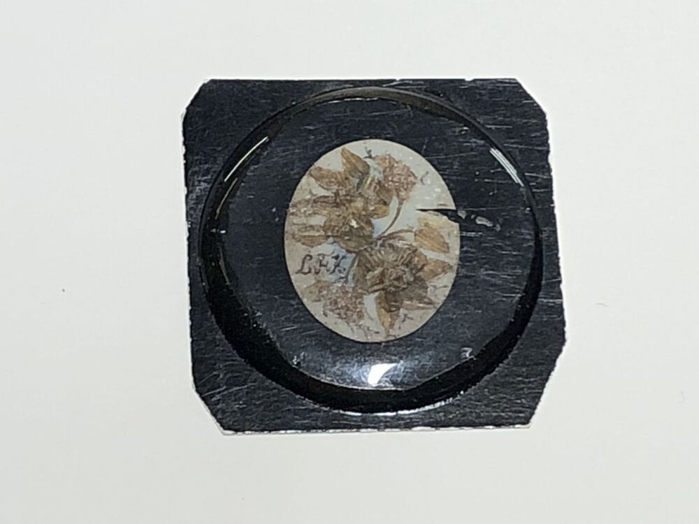Medaillon van wit been, ovaal, waarop rouwvoorstelling van geplakt middelblond haar. Een bouquet wartussen de letters L F K