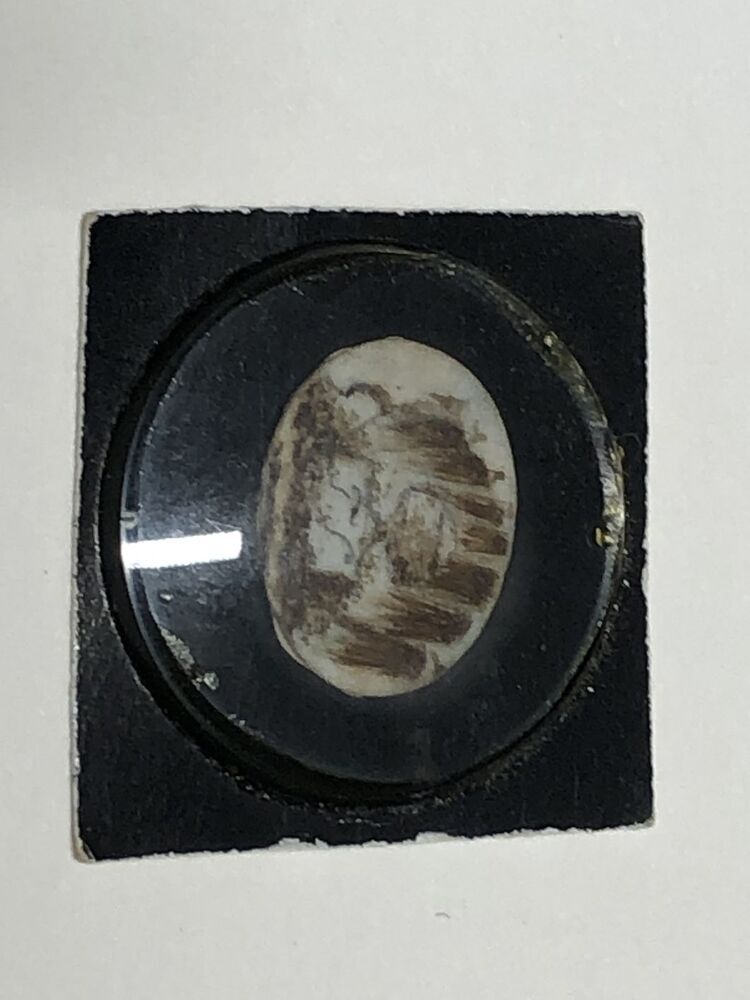 Medaillonplaat van wit been waarop een rouwvoorstelling, geplakt haar en schilderwerk, een urn of vaas op een rechthoekige steen