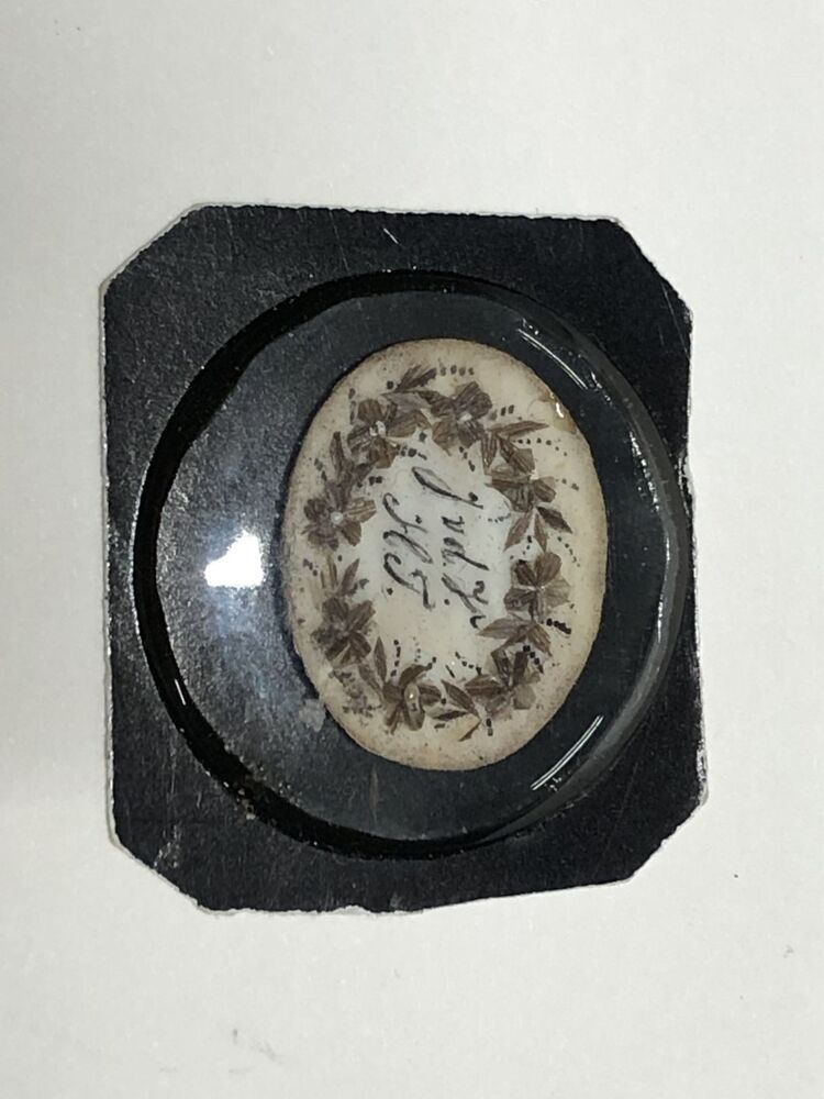 Medaillonplaat van wit been hierop een voorstelling van deels geplakt haar, schilderwer en van kleine pareltjes, en bloemenkrans