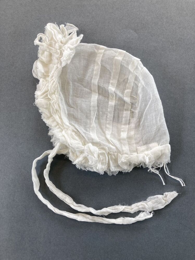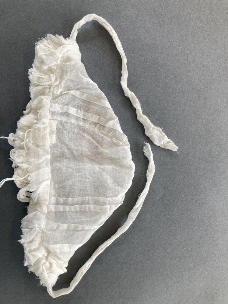 Rouwmuts met bol en strook van neteldoek afgezet met ongezoomde stroken