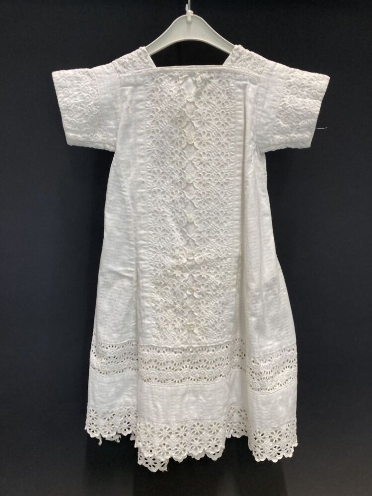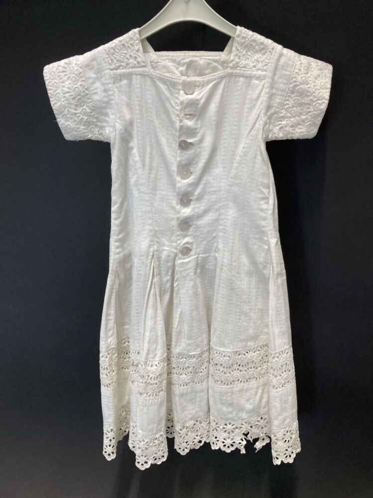 Jurk van katoenen ajourweefsel in princesselijn, afgezet met broderie