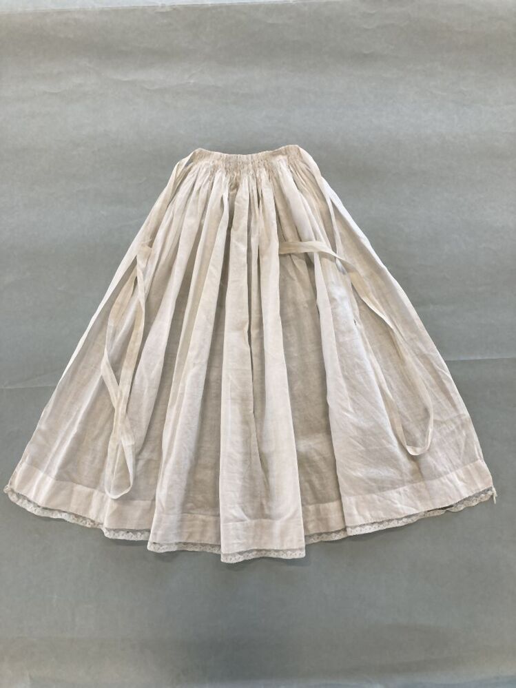 Kinderschortje van wit katoen met ingeweven ruitje, afgezet met kantje