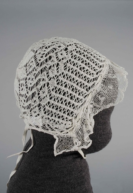 Kindermutsje van ajourbreiwerk met rosetvormige bol, afgezet met Rijssels kloskant, onderdeel van groep van negen