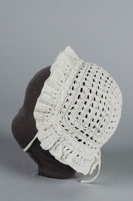 Kindermutsje van ajourbreiwerk met streeppatroon en gebreide ruches, onderdeel van groep van negen