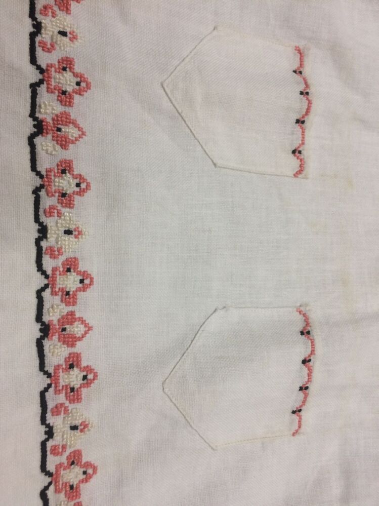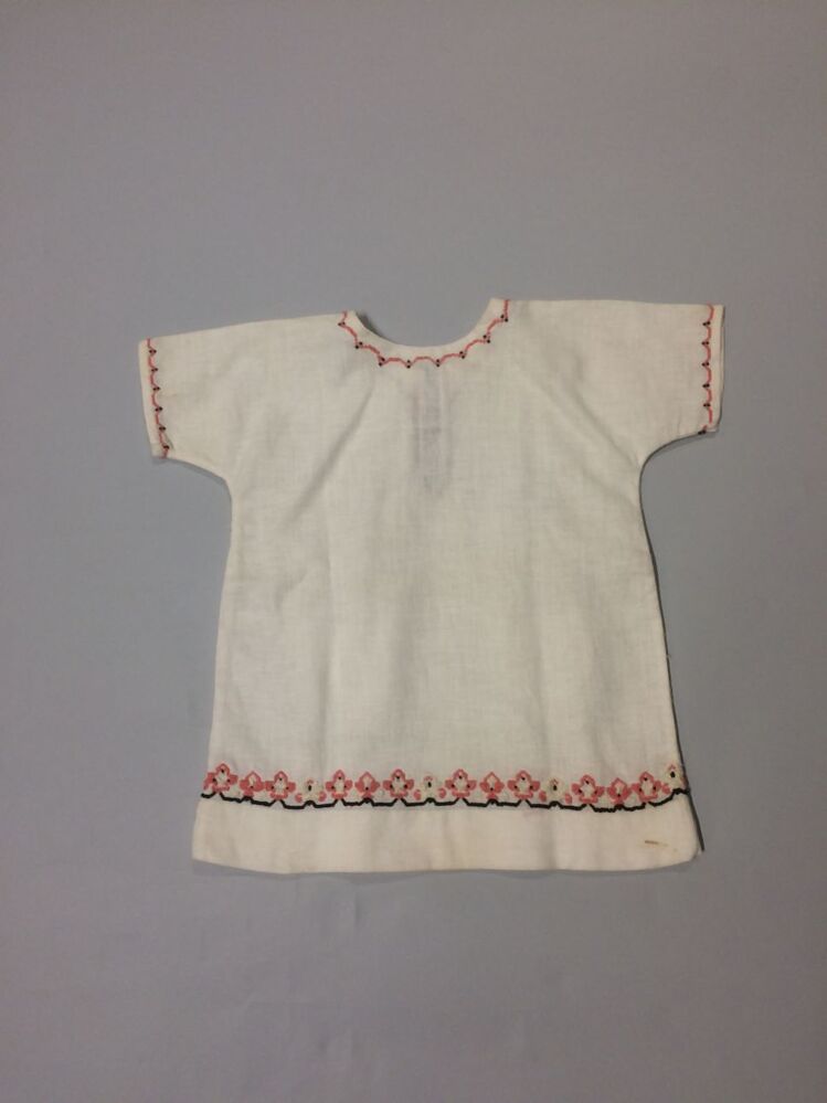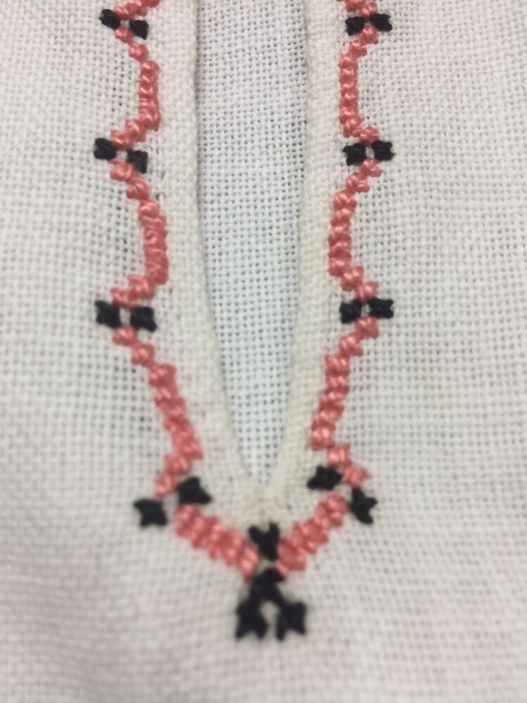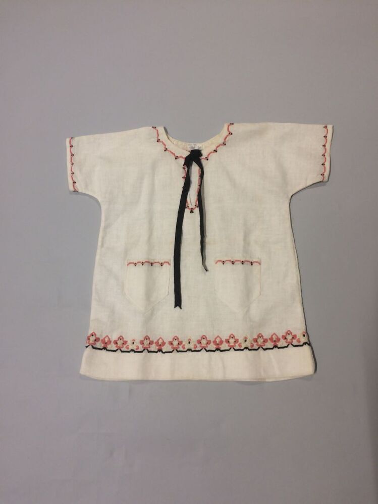 Hemdjurk van grof wit katoen met roze, zwart en wit kruissteekborduursel en zwarte strik bij de hals
