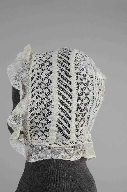 Mutsje van ajoubreiwerk van katoen in twee diktes, afgezet met Mechels kloskant, onderdeel van groep van drie