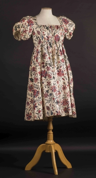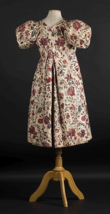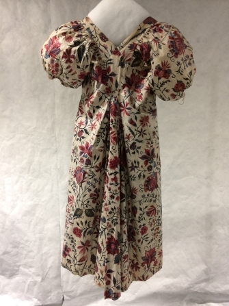 Sitsen Empire vrouwenjak, met korte pofmouwen, beschilderd met in elkaar grijpende bloemranken met gevarieerde bloemen op witte grond