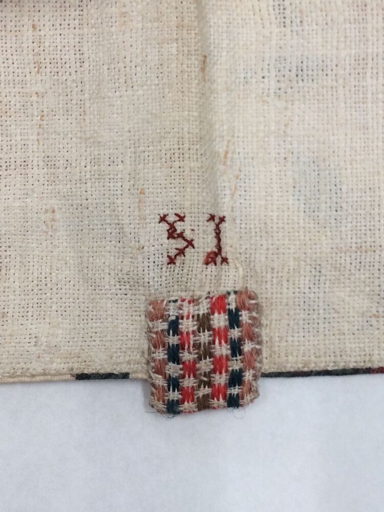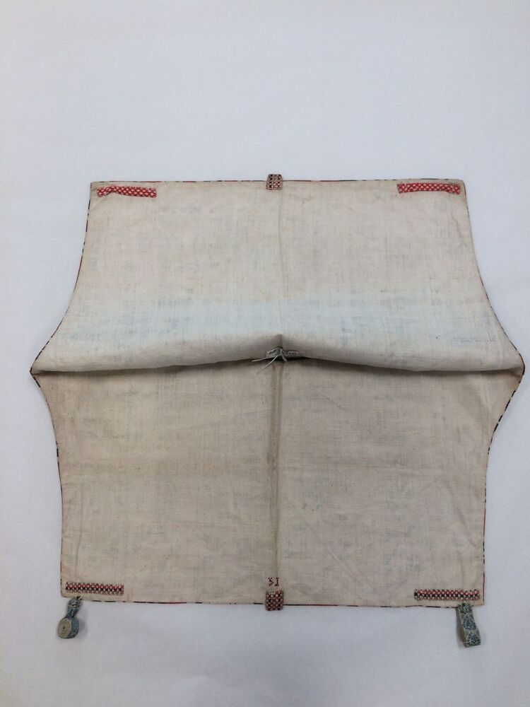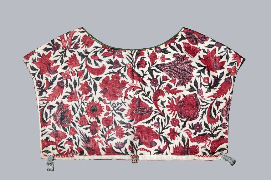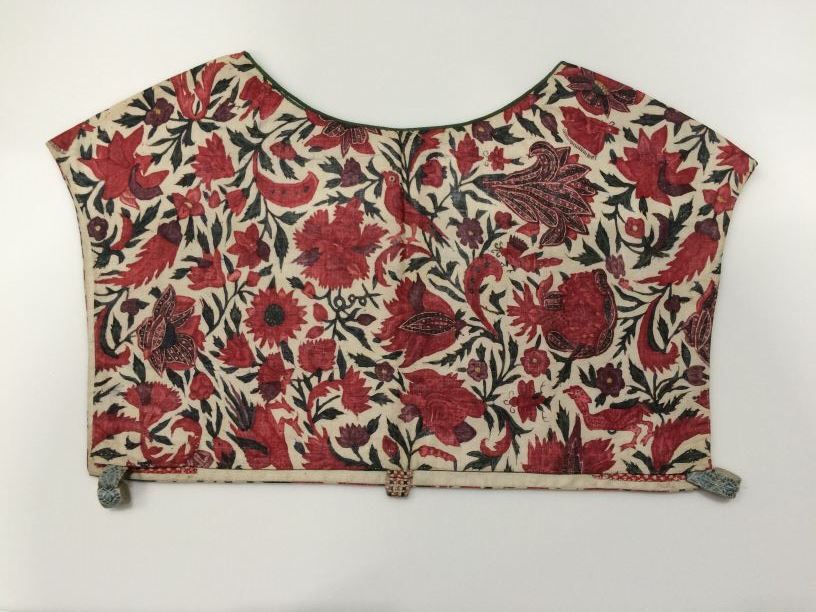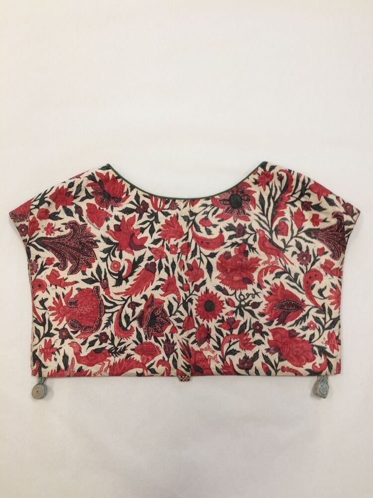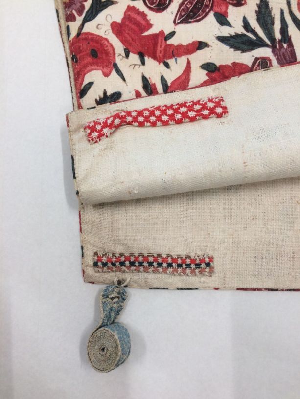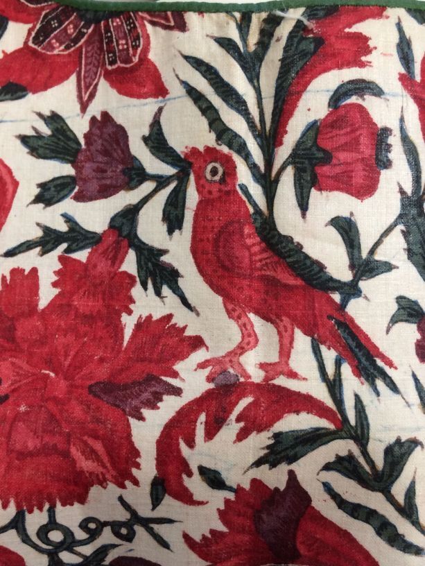 Sitsen vrouwenkroplap ofwel onderst, glanzend, met naturalistische rode bloemen, vogels en insekten, op witte grond,gemerkt HI