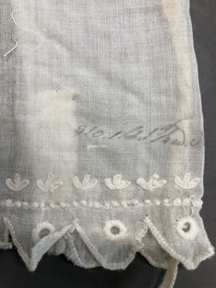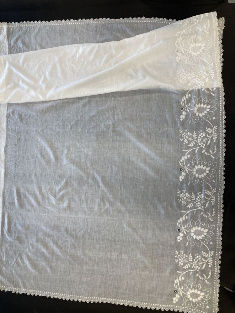 Groot schort van neteldoek met zich herhalend groot geborduurd bloemmotief langs zoom