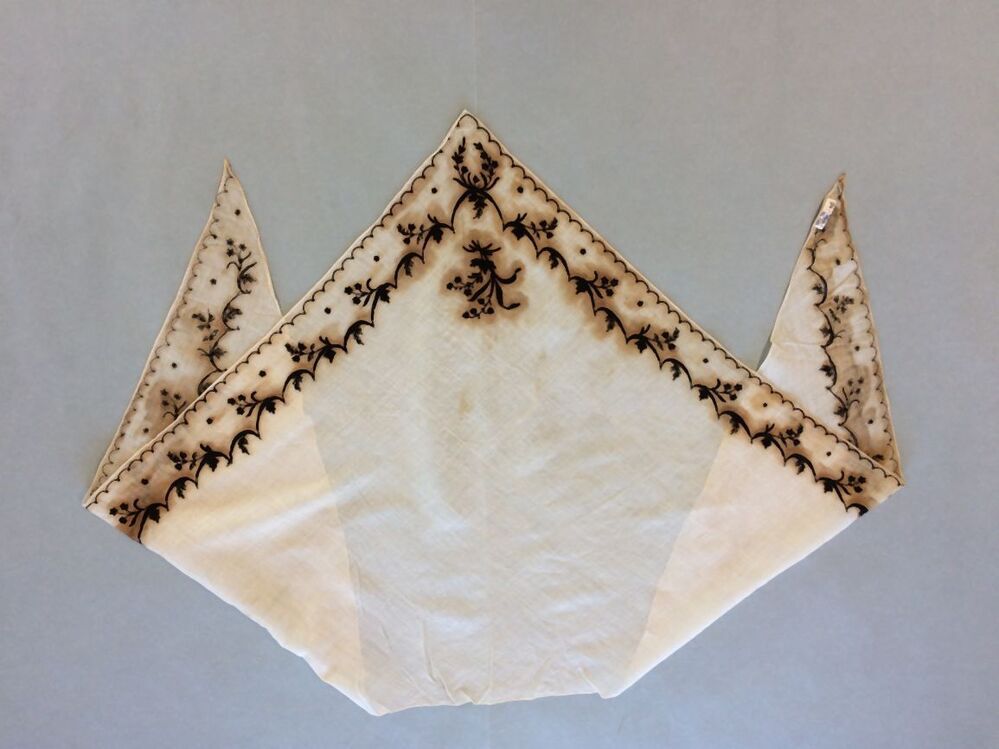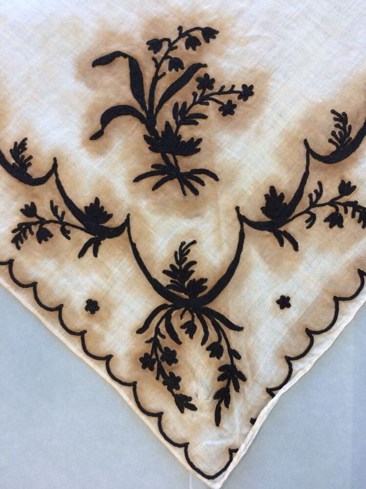 Driekantige doek van neteldoek met zwart zijden getamboereerde guirlande