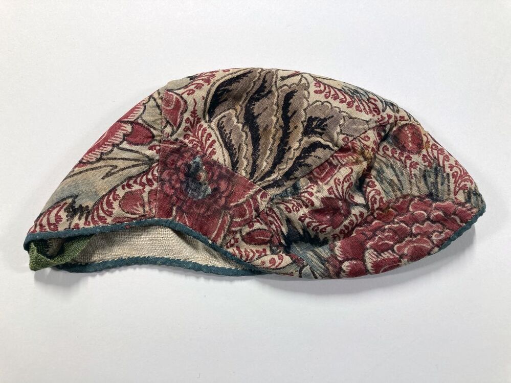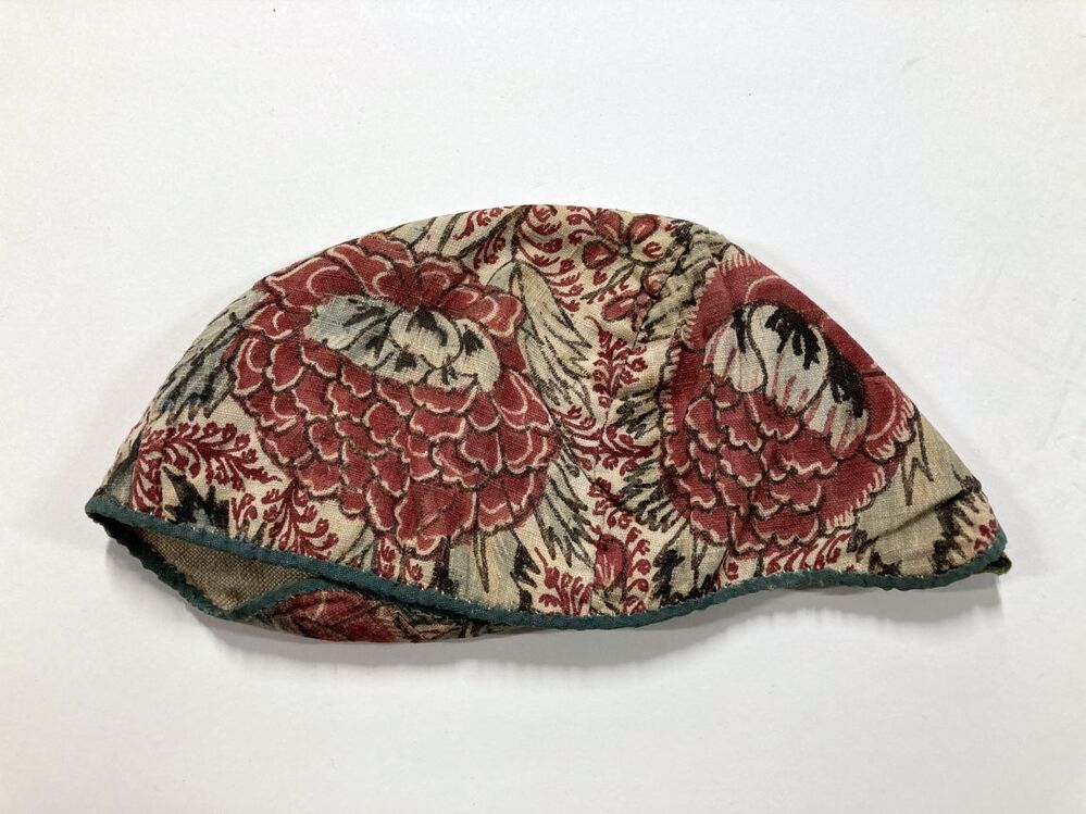 Sitsen meisjesmuts, met dicht patroon van ronde bloemen en rode varens op witte grond