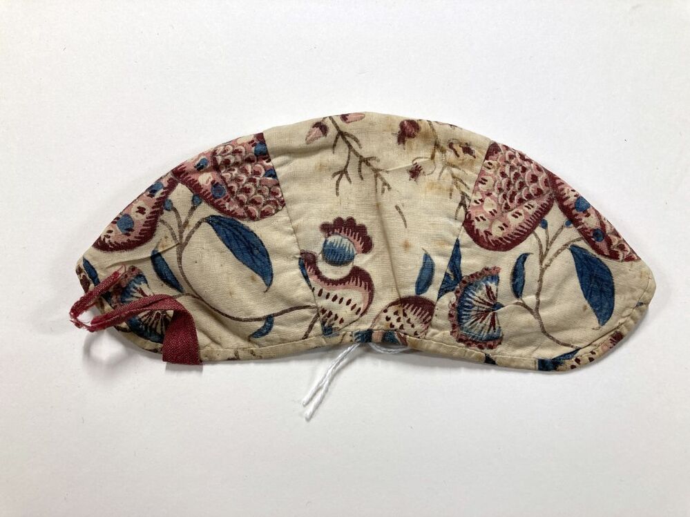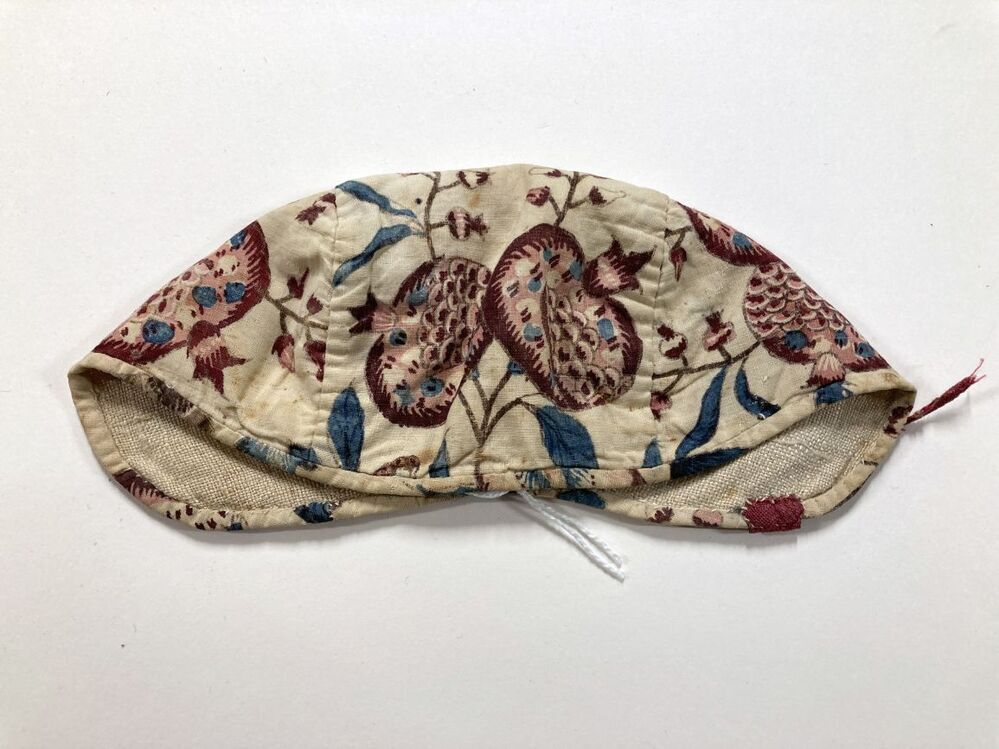Sitsen meisjesmuts, met dunne ranken met granaatappeltjes op witte grond