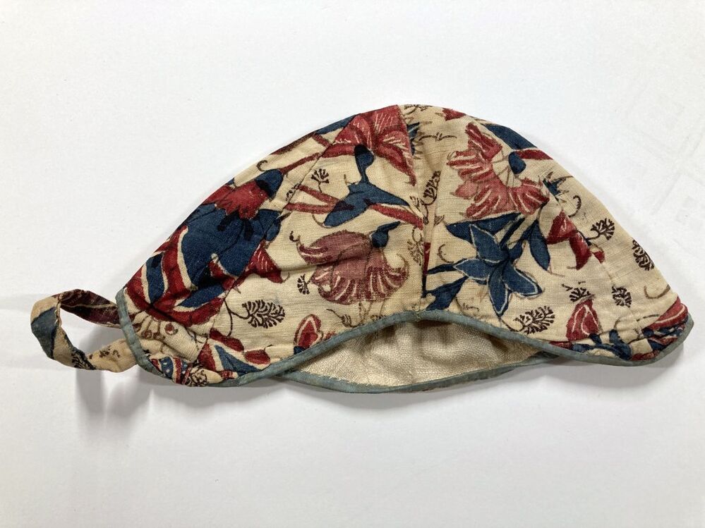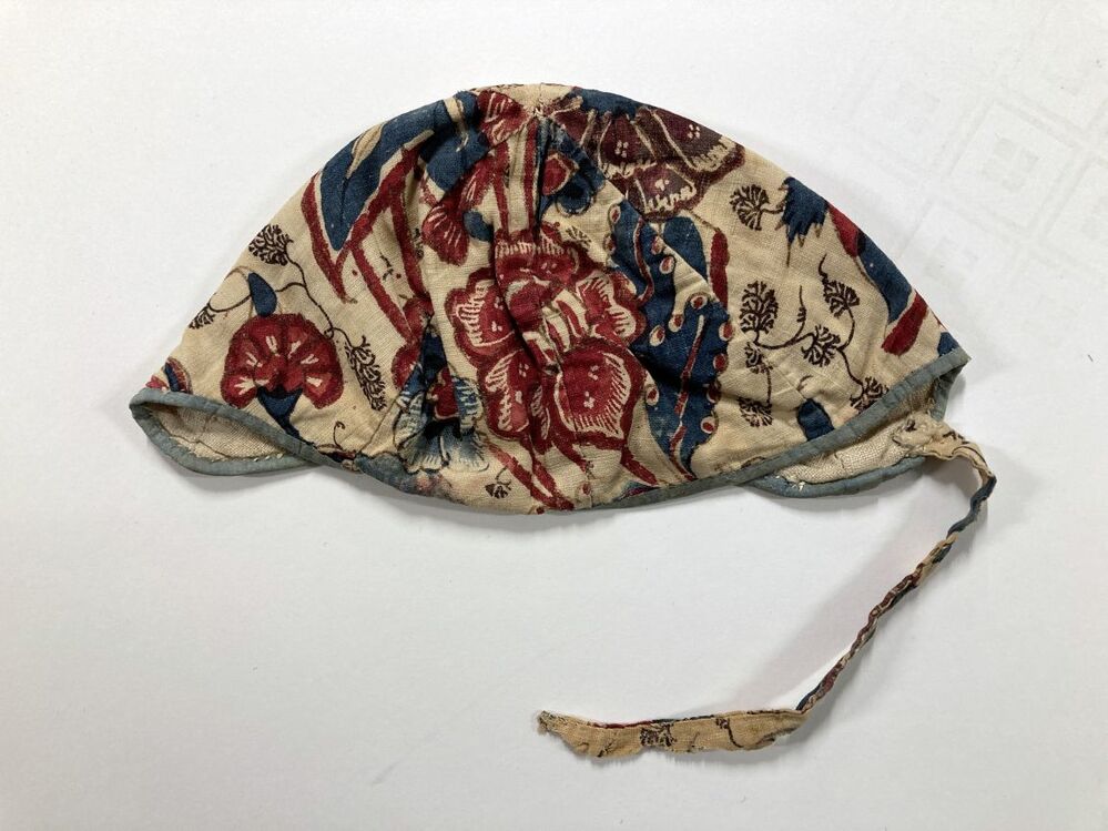 Sitsen jongensmuts, met grof bloempatroon met 'elzenpropjes' op witte grond