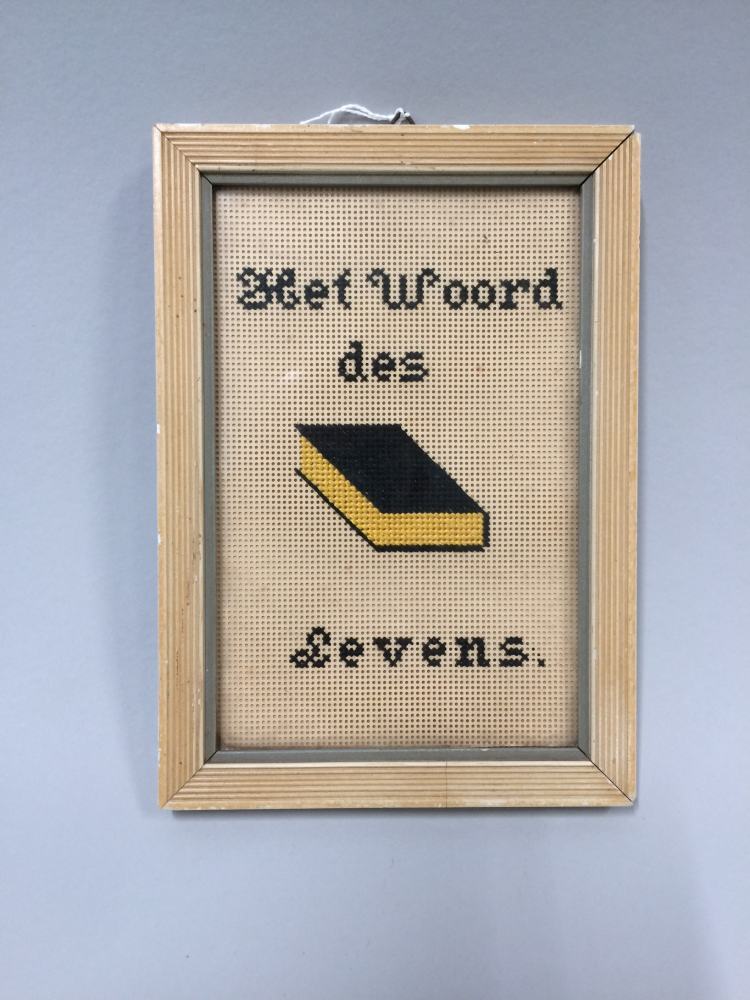 Borduurwerk, petit point op geperforeerd karton in lijst: Het Woord des Levens