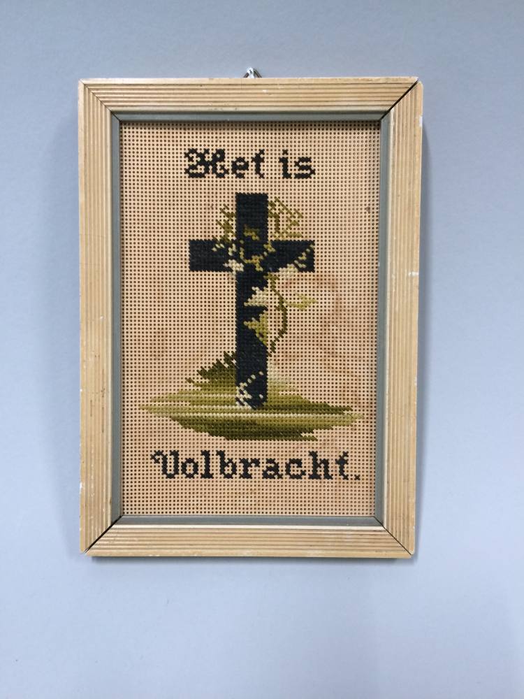 Borduurwerk, petit point op geperforeerd karton in lijst: Het is Volbracht