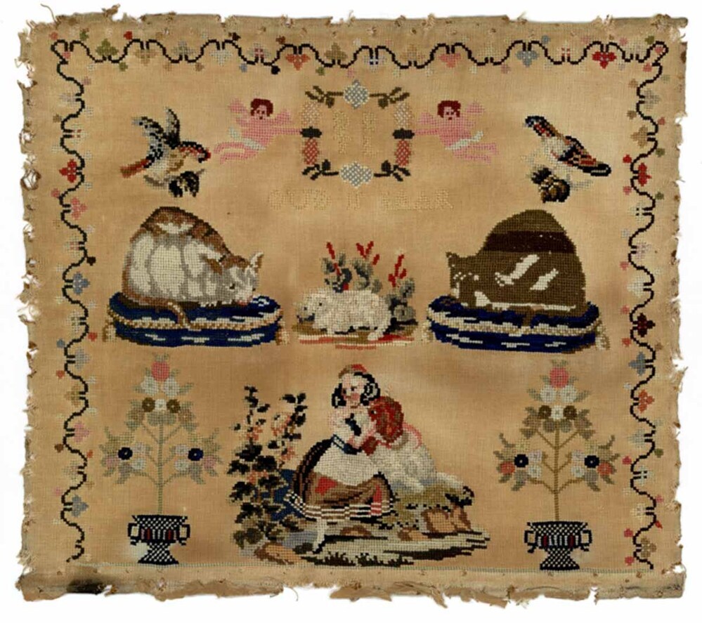 Borduurstuk met twee poezen, gemerkt D.B.T.L., oud 11 jaar