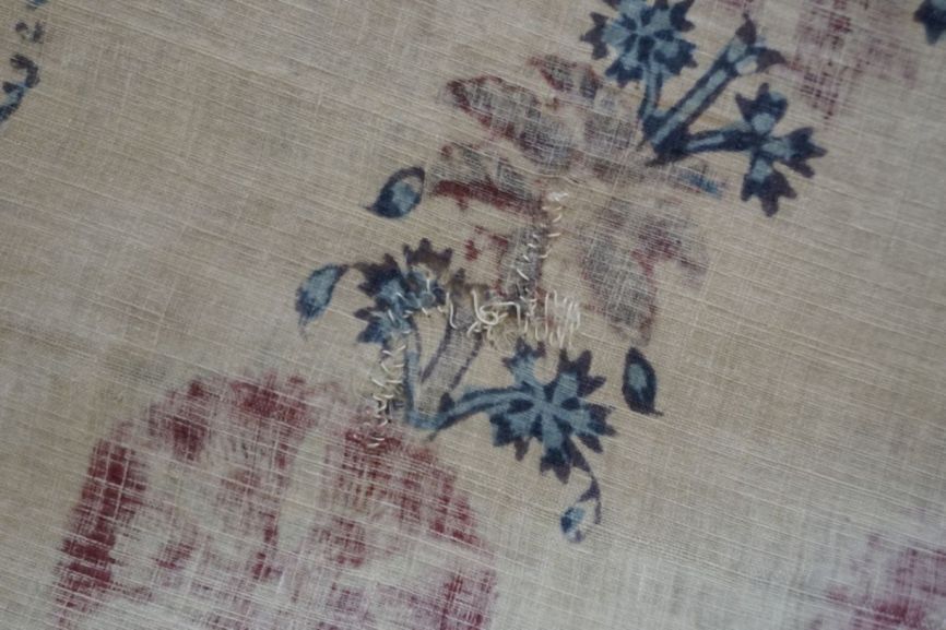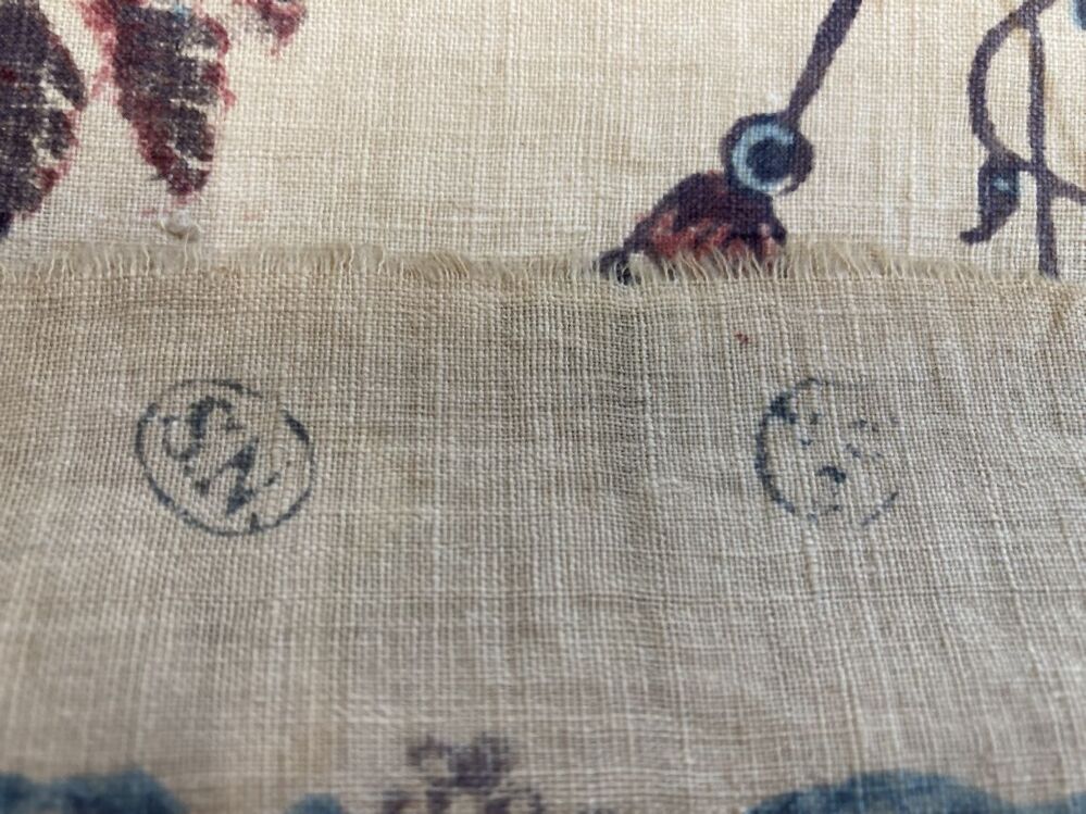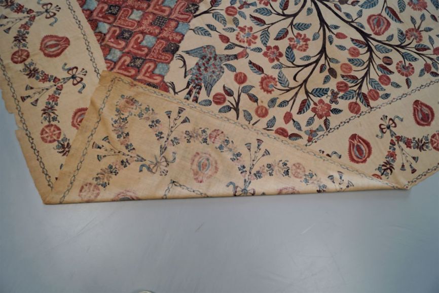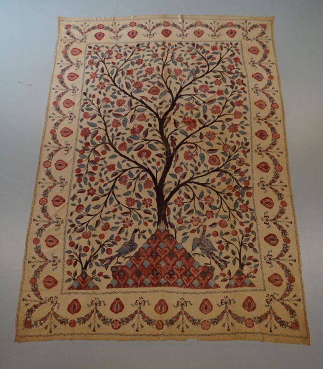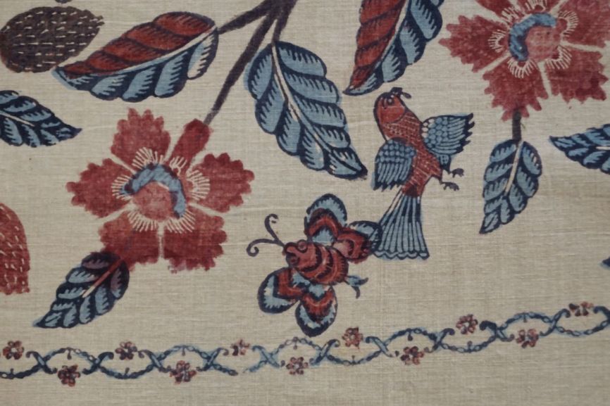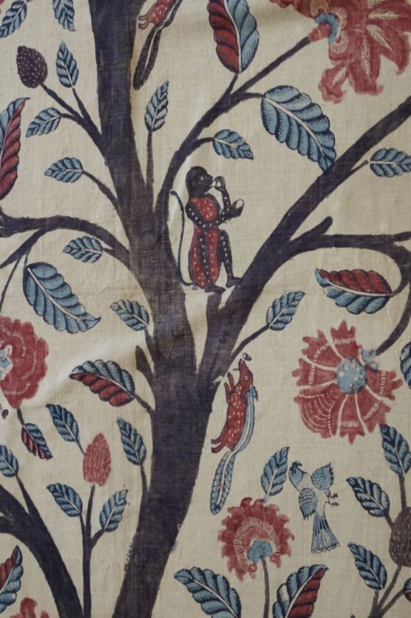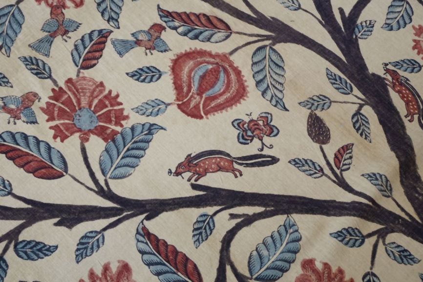 Sitsen palempore met bloeiende boom met luchtwortels, en diverse dieren tussen de takken, deels gedrukt, op witte grond
