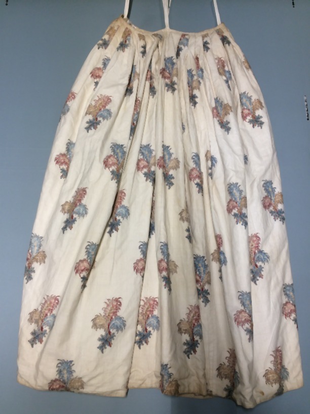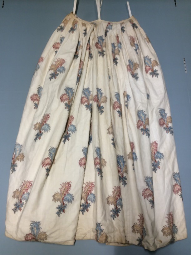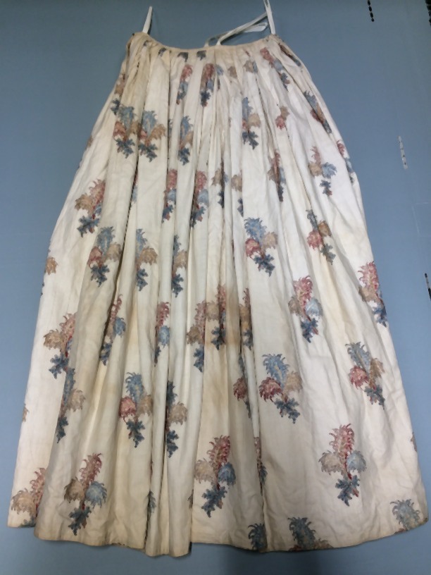 Sitsen vrouwenrok, gedrukt in Europa met boeketten van pluimen op witte grond.