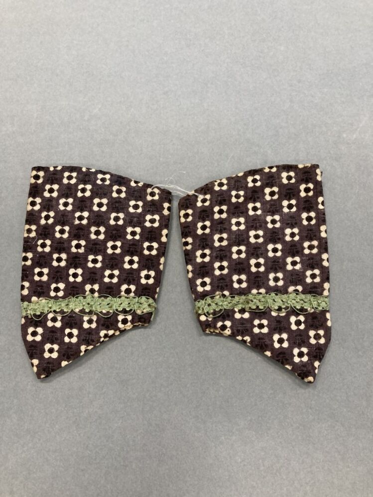 Paar baby-mouwtjes van bedrukt katoen, paars fond met uitgespaarde bloem, groen galon