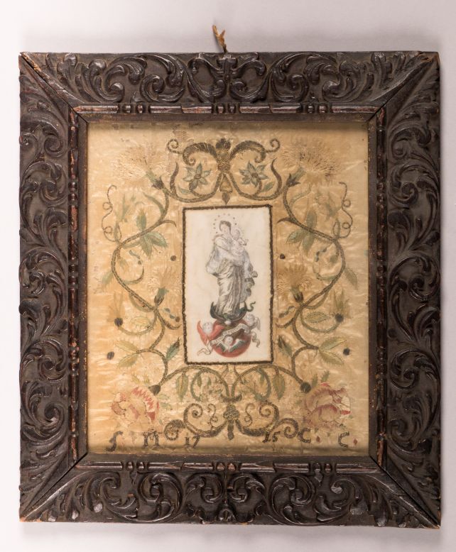 Borduurstuk, gedrukte afbeelkding van Madonna met kind op hemelbol, omgeven door borduurwerk met zijde en gouddraad, floraal, rozen en anjers, gewerkt, ingesneden