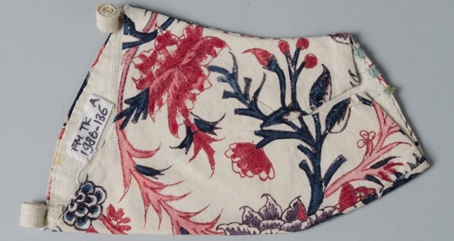 Sitsen kindermouwtje, versierd met lichtblauw zijden lintje, met groot bloemmotief op witte grond