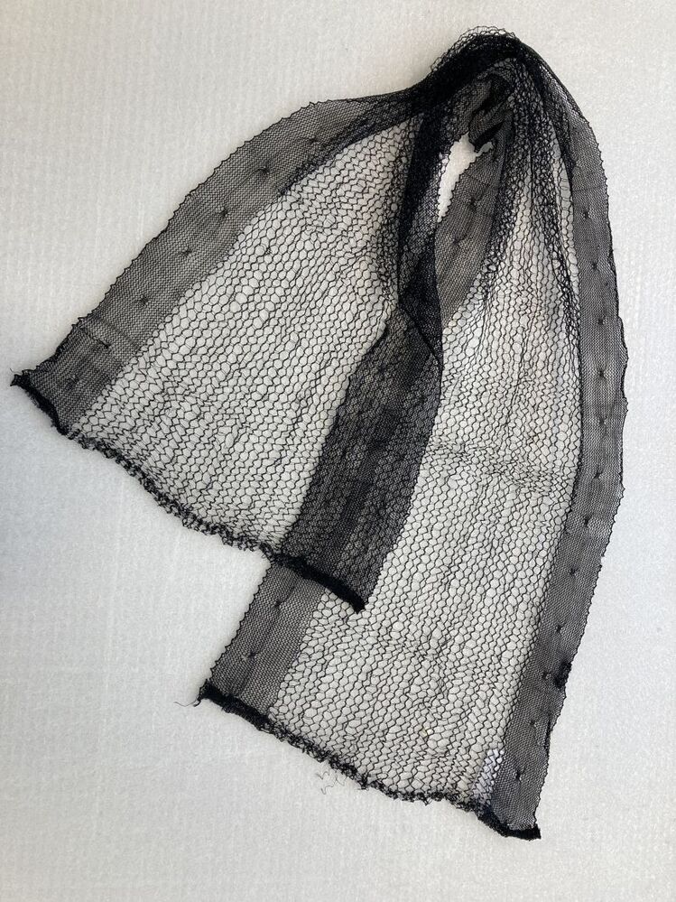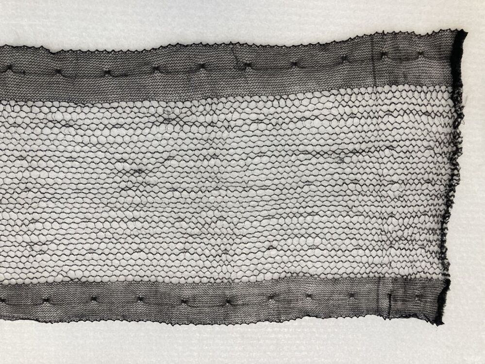 Zwarte sjaal van kettingtricot in open honingraatpatroon met dichtere randen