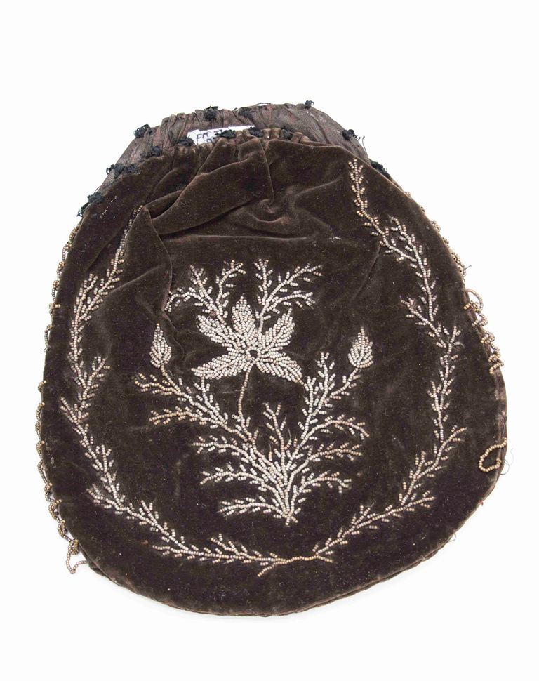 Bruin fluwelen tas met floraal motief in metalen kralen, zonder beugel