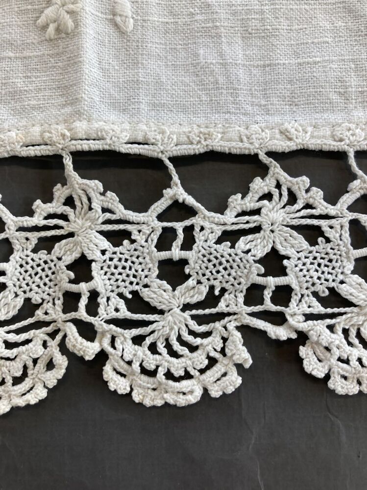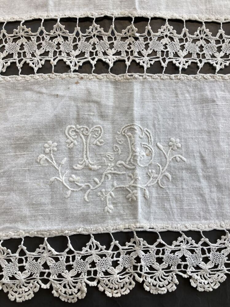 Boveneinde van laken met tussenzetsel en kant van haakwerk met mignardise, met borduursel TB 1896 in bloemrank