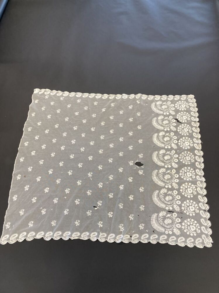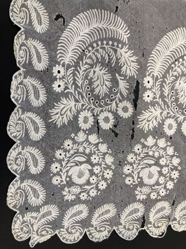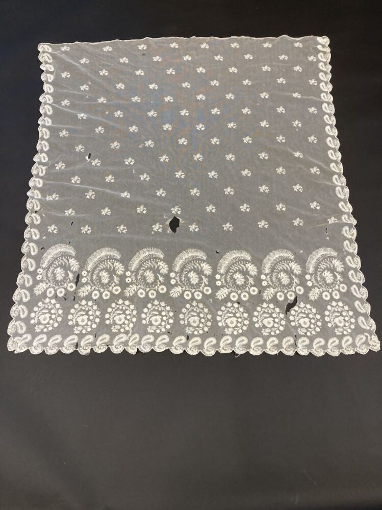 Schort van witte tule met floraal tamboereerwerk, met strooimotieven en grote motieven langs de zoom