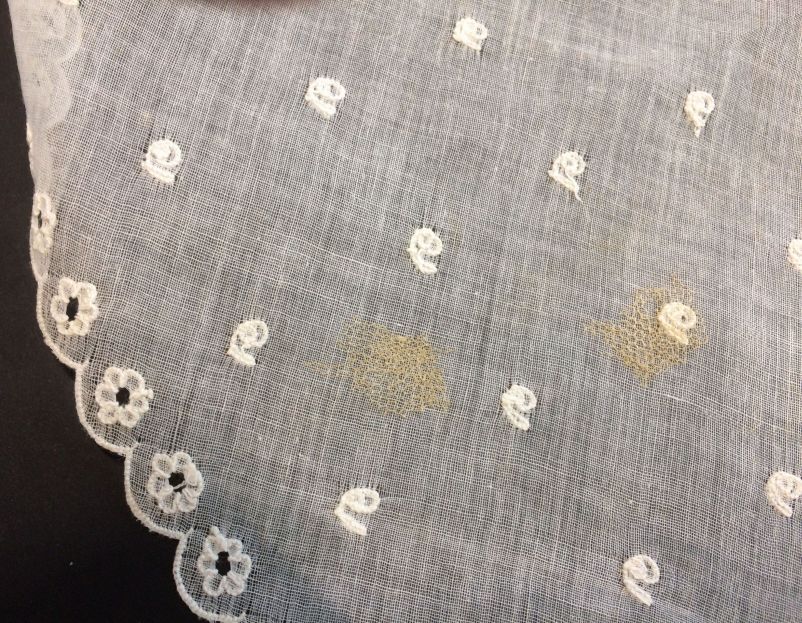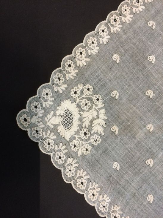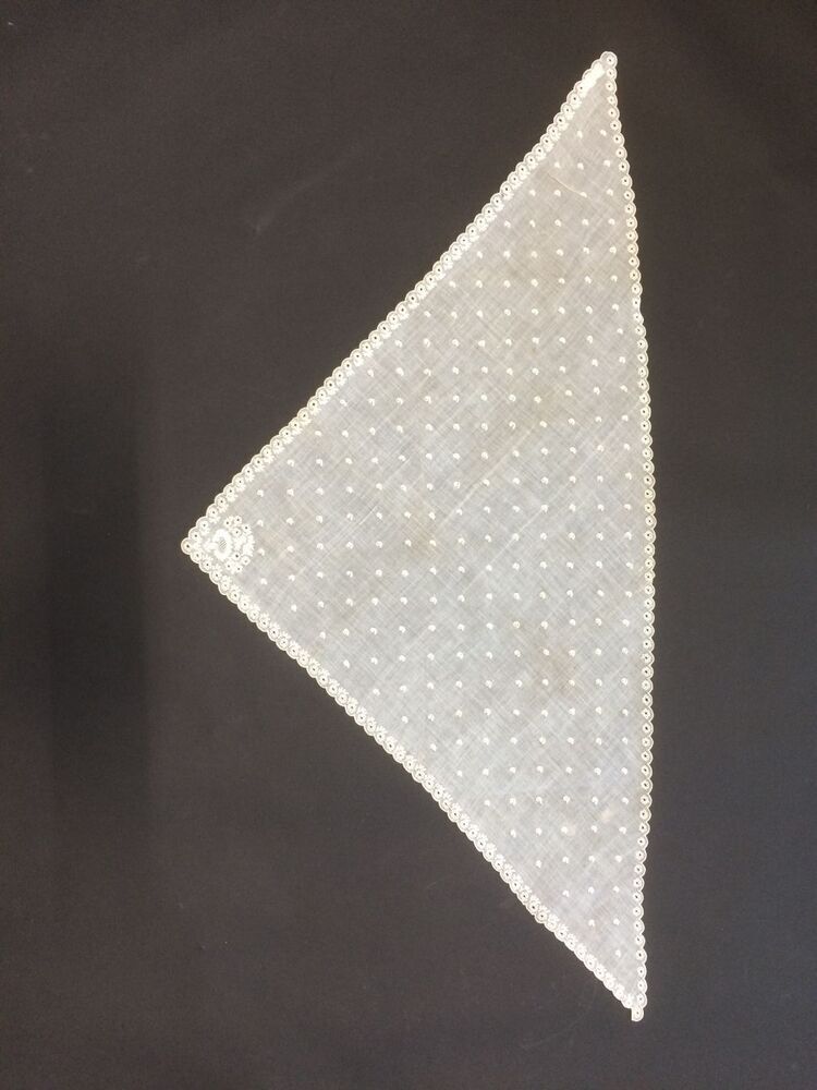 Fichu van glasbatist, rondom geschulpt, met getamboereerde bloemetjes en waaiervormig hoekmotief