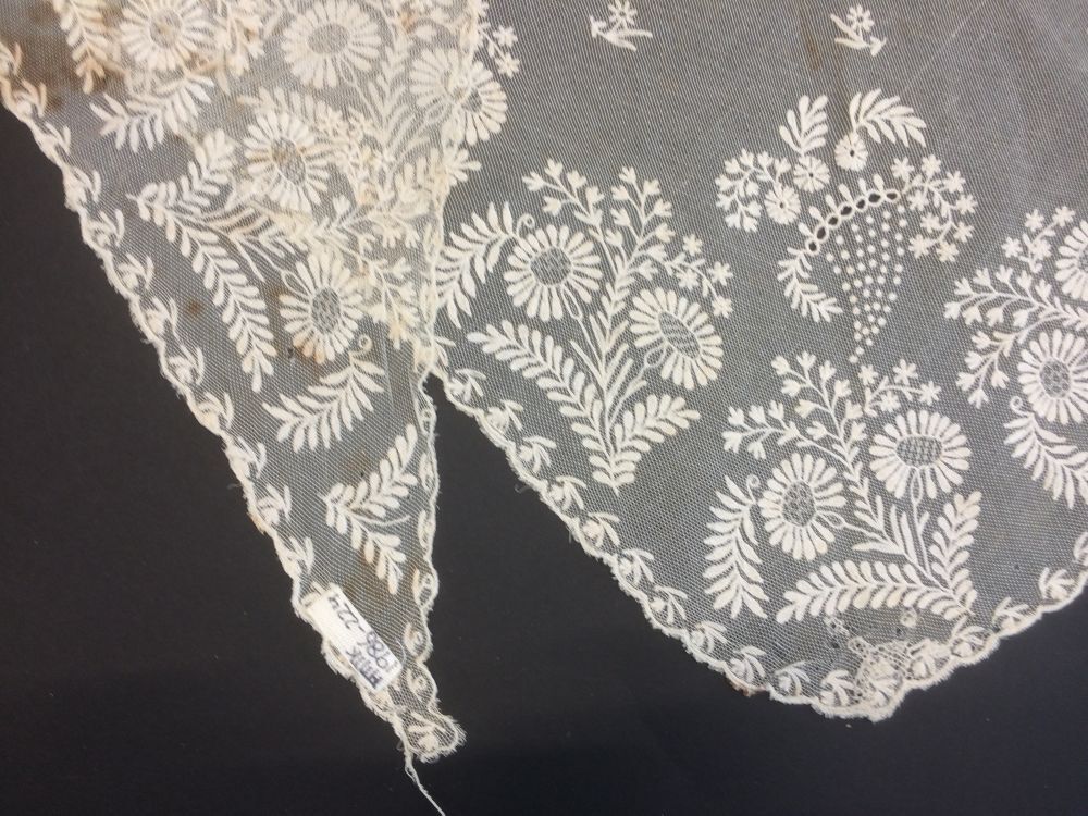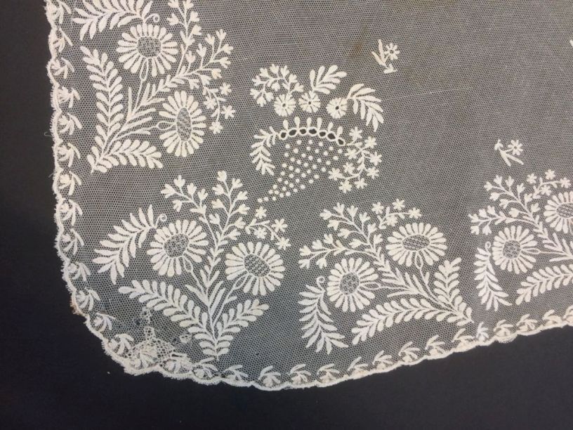 Fichu van witte tule met getamboereerde grote bloemen langs de rand, in de hoek een genopte hoorn met daaruit een boeket