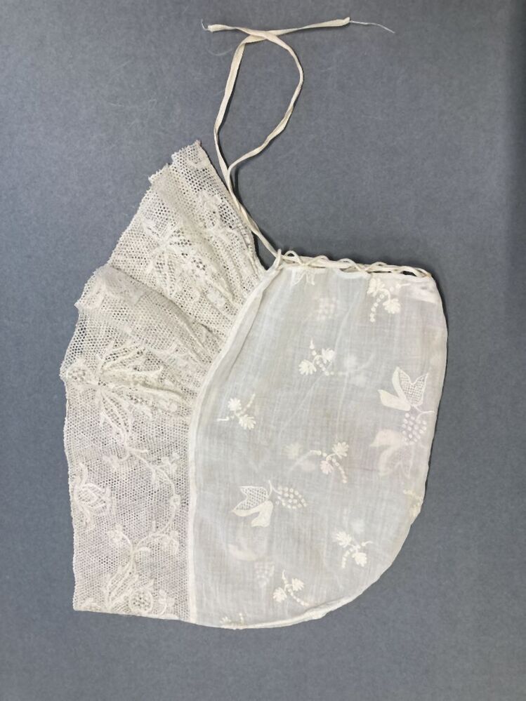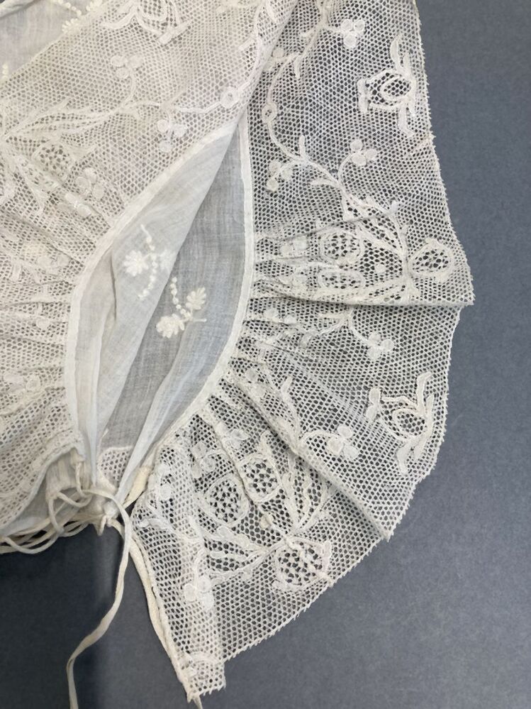 Muts, bol van getamboereerde neteldoek, strook (alleen langs gezichtszijde) van Antwerpse pottekant