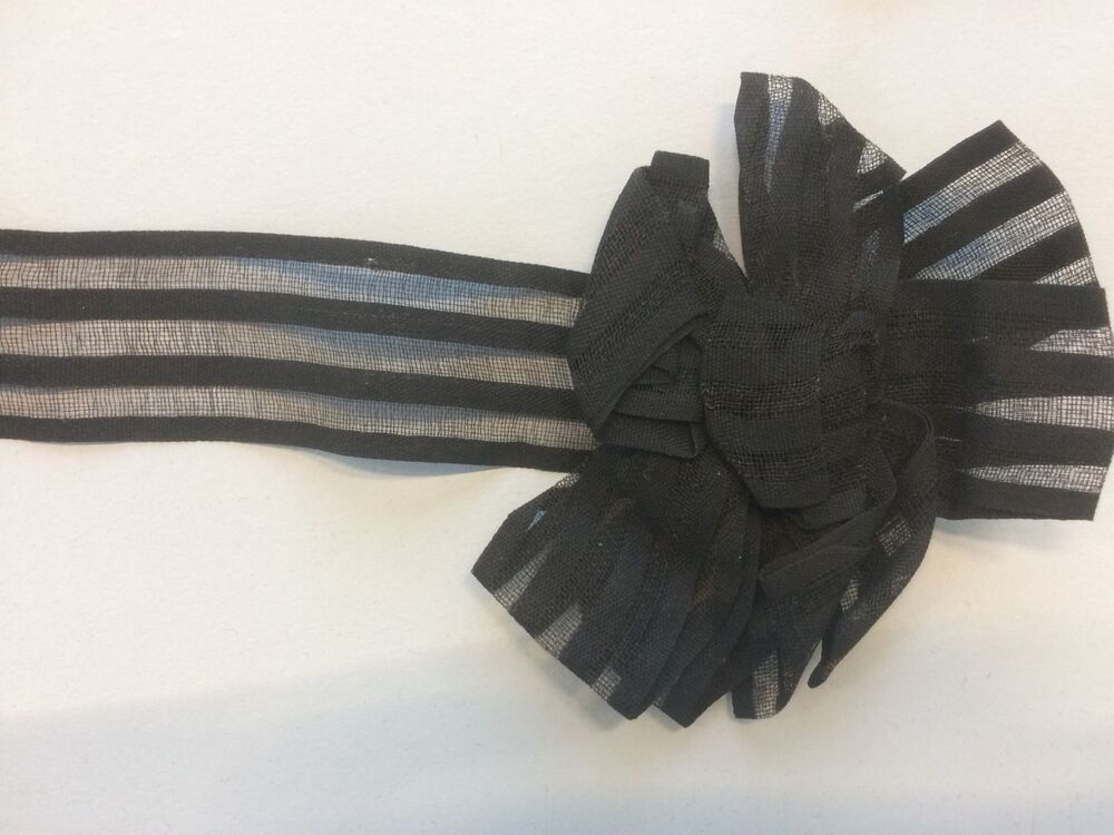 Zwart rouwlint met ajourstrepen in drie delen, waarvan twee met een rozet.