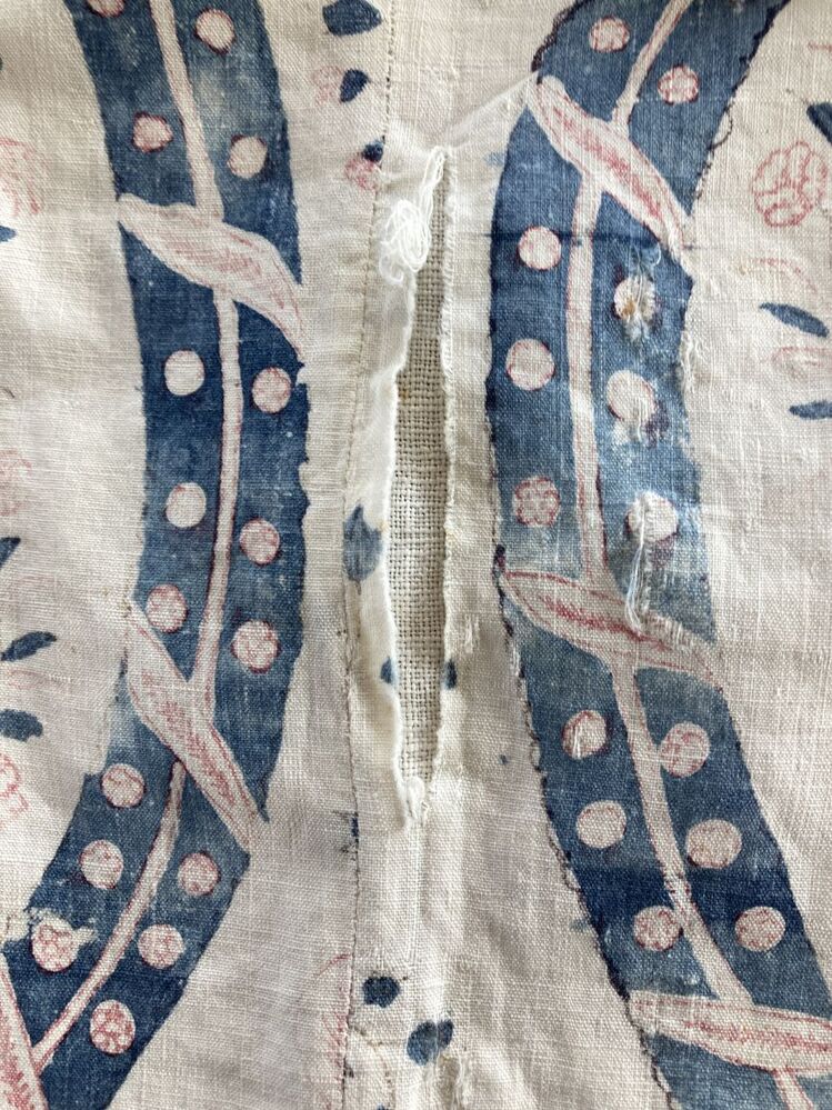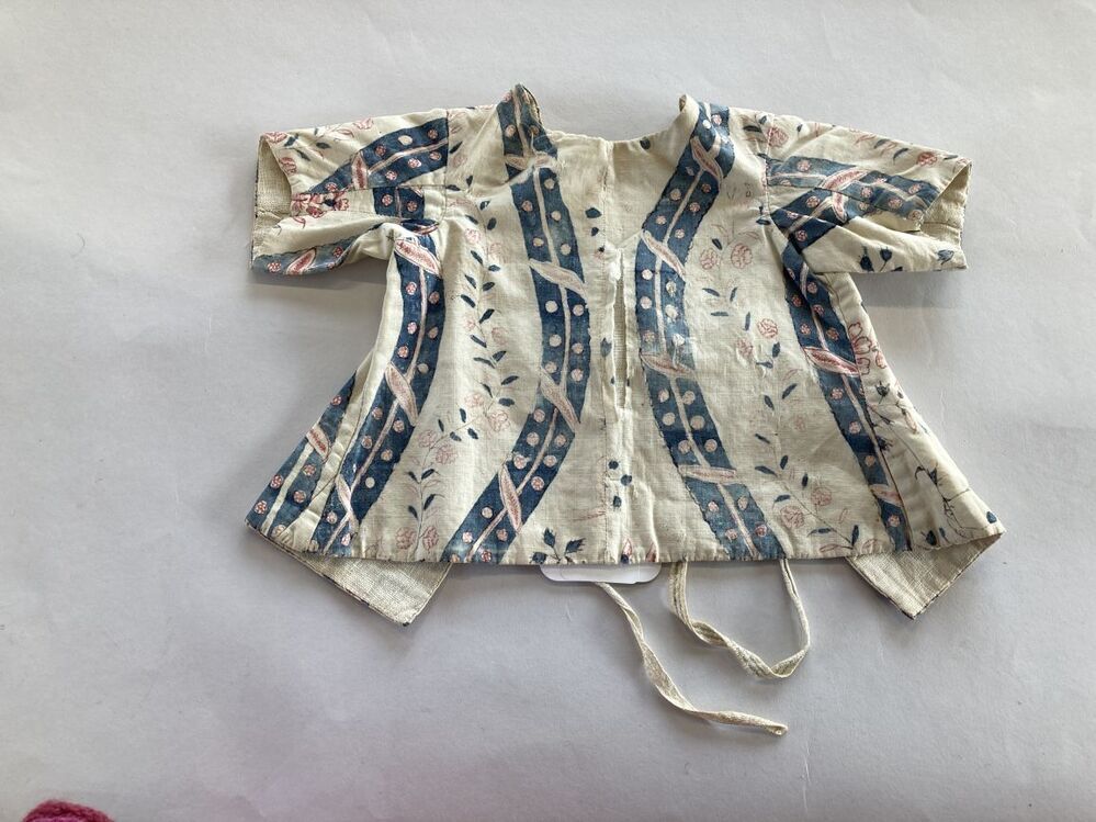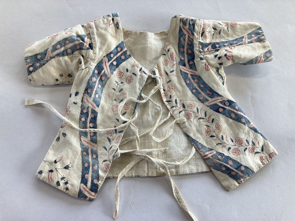 Sitsen babyjakje, met korte mouwen, beschilderd met evenwijdige golvende randen met dunne bloemrank met vogeltjes op witte grond