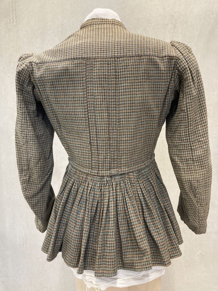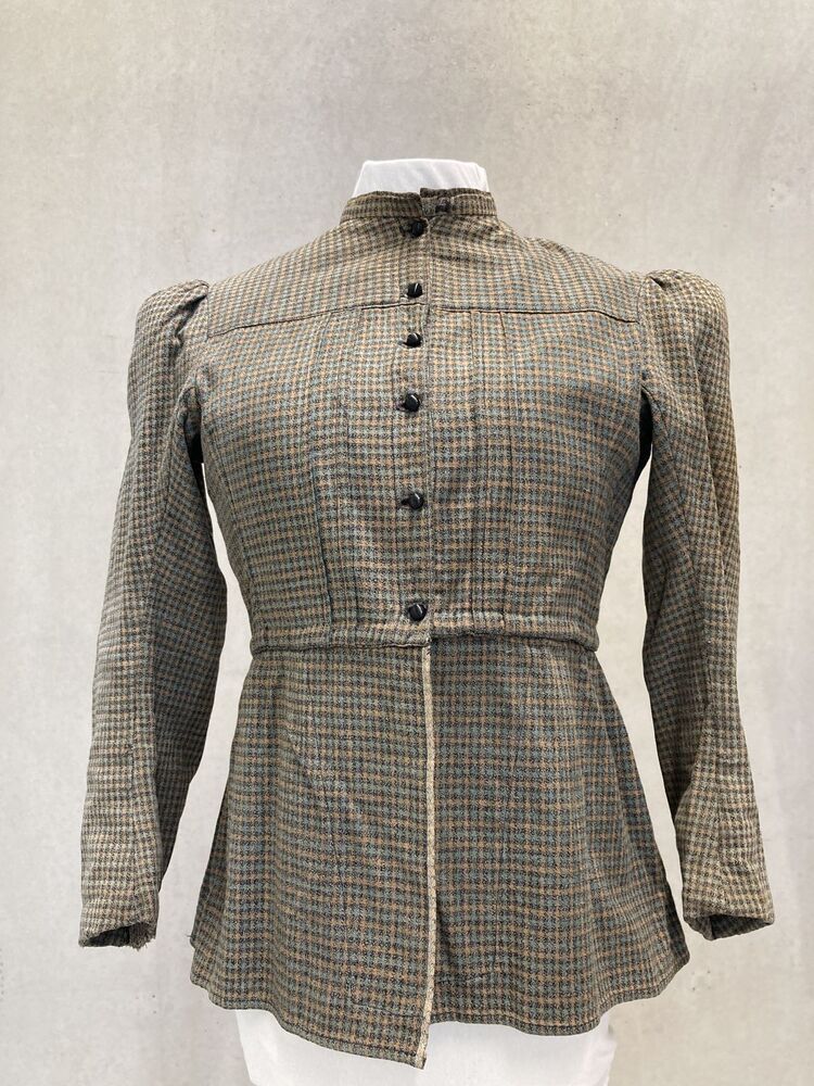 Eenvoudig vrouwenjak met schoot en lange kopmouwen van geruite wol, met glazen knoopjes