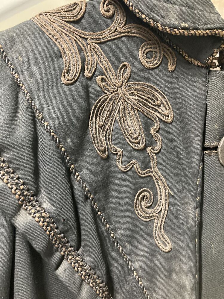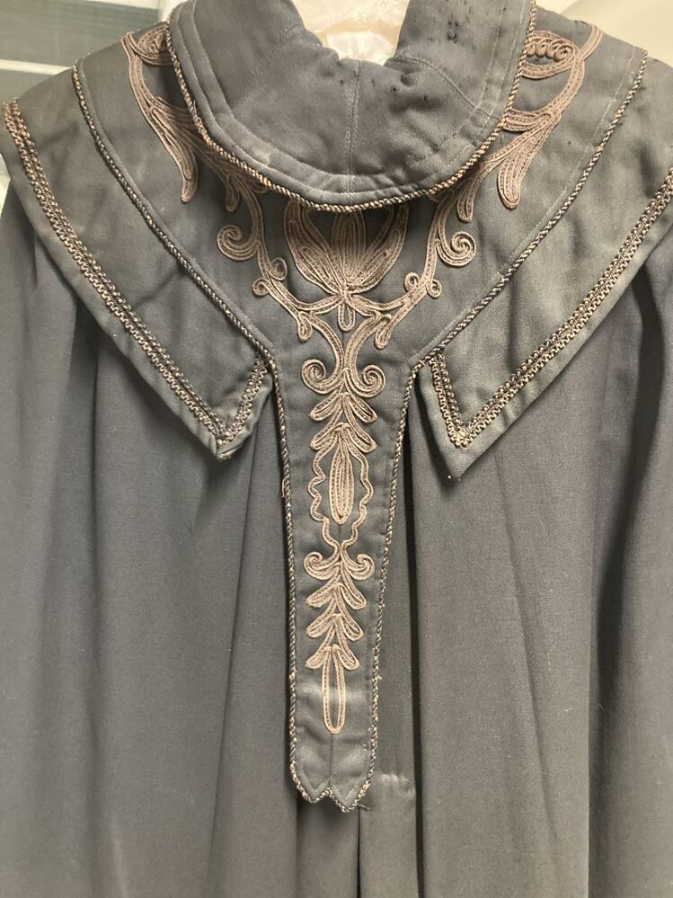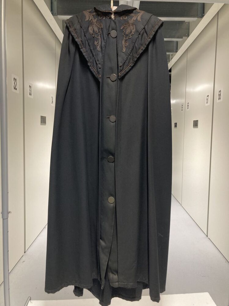 Zwarte cape met pelerinekraag, met bloemversiering van opgenaaid veterband