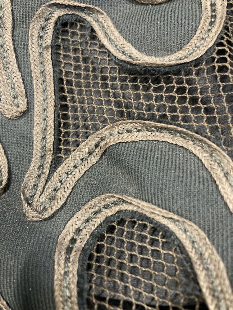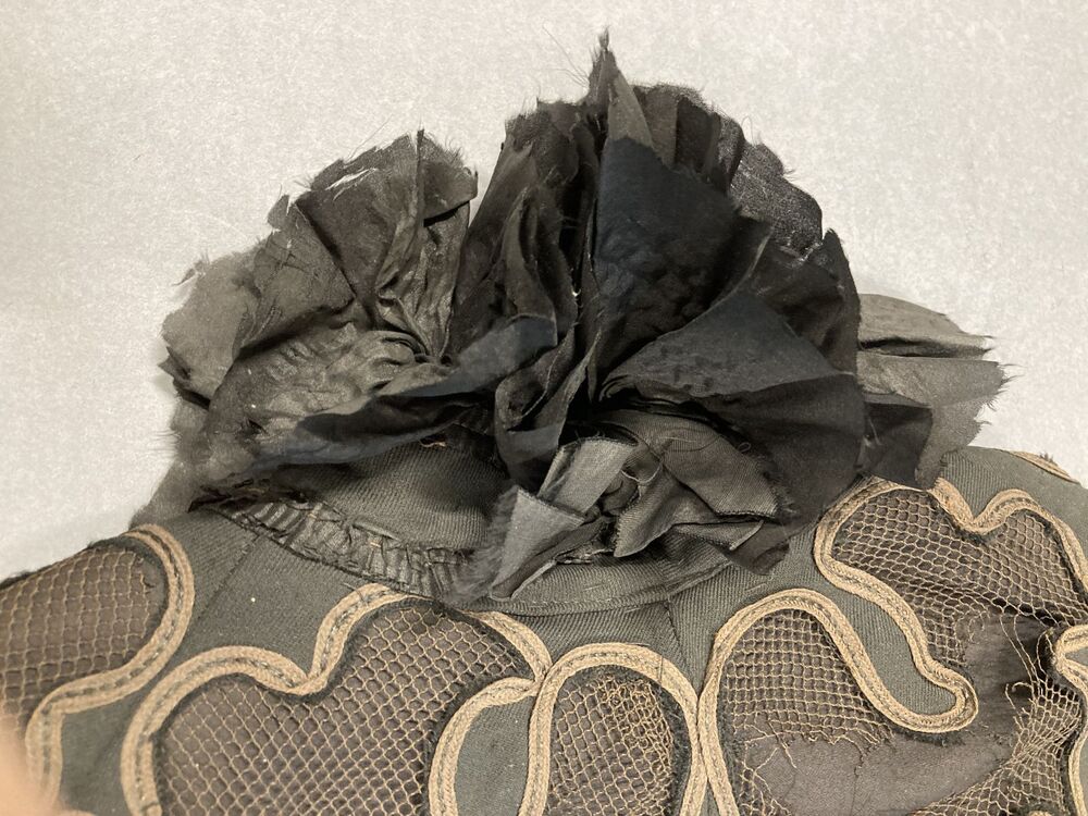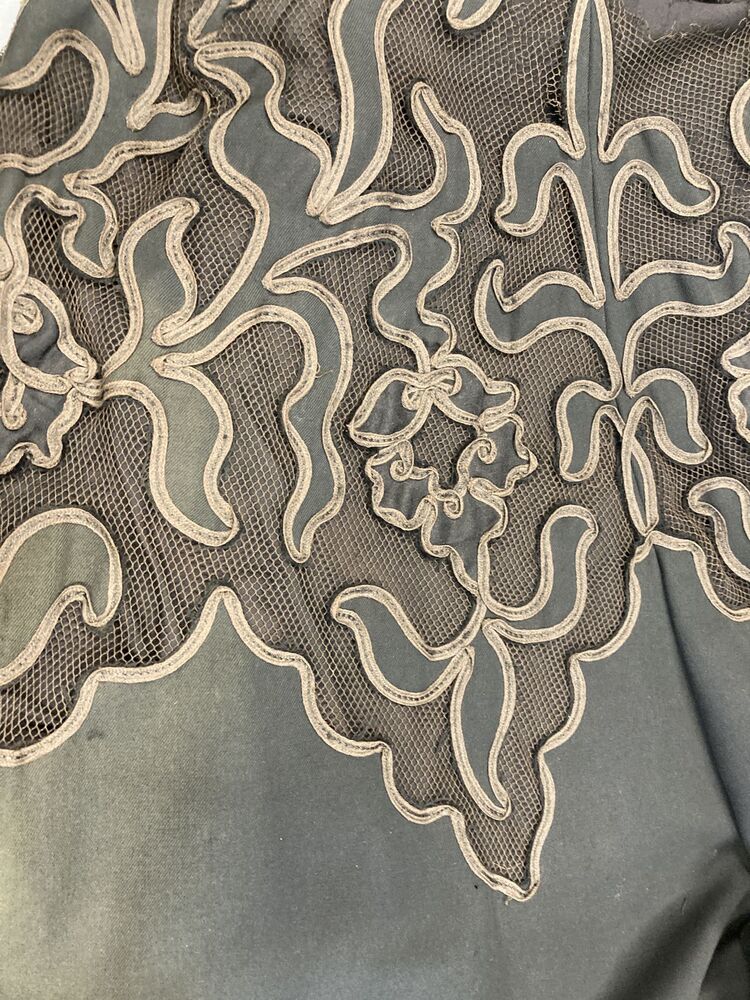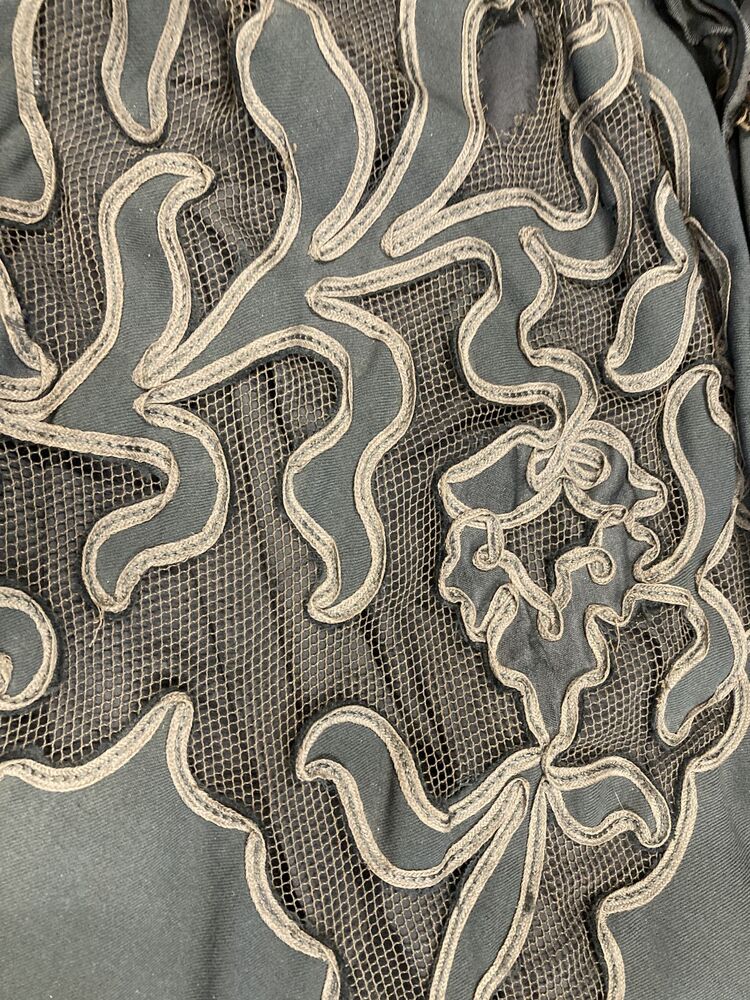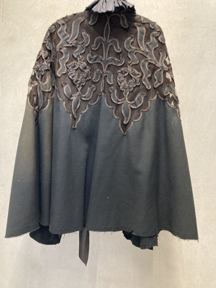 Knielange klokkende cape van zwart wollen serge met ajour motief geapplikeerd op tule met zijden kraagje