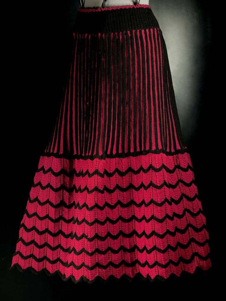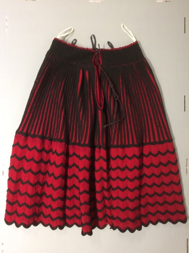 Gebreide onderrok van rode en zwarte wol, in lengtestrepen met zigzagstrepen aan de onderkant