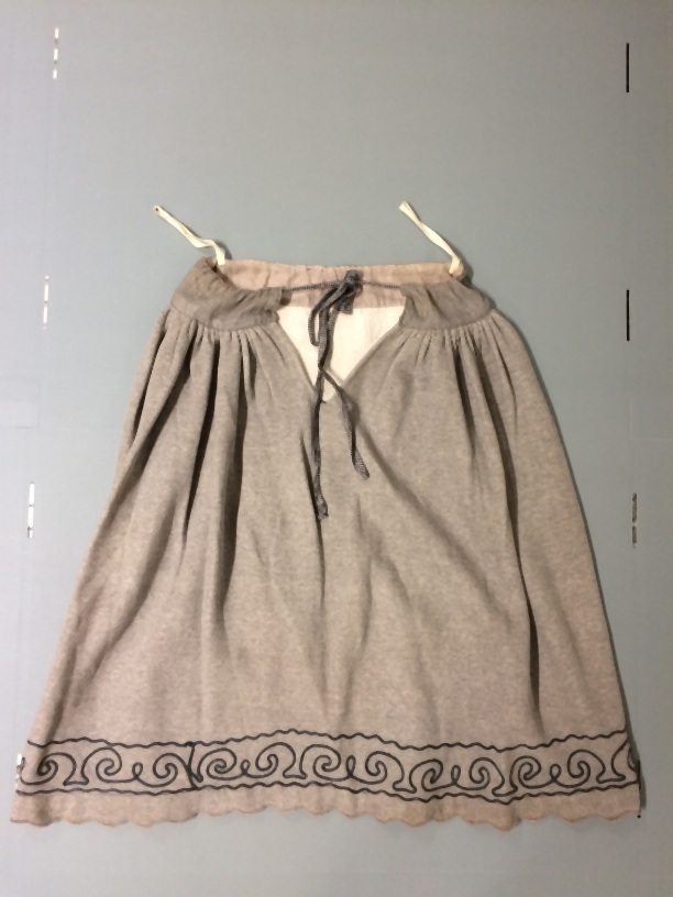 Lichtgrijze gestreept flanellen onderrok van gevoerde tricot, met rand langs zoom van soutache band