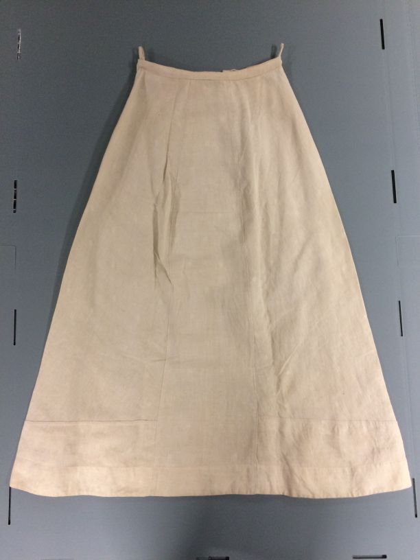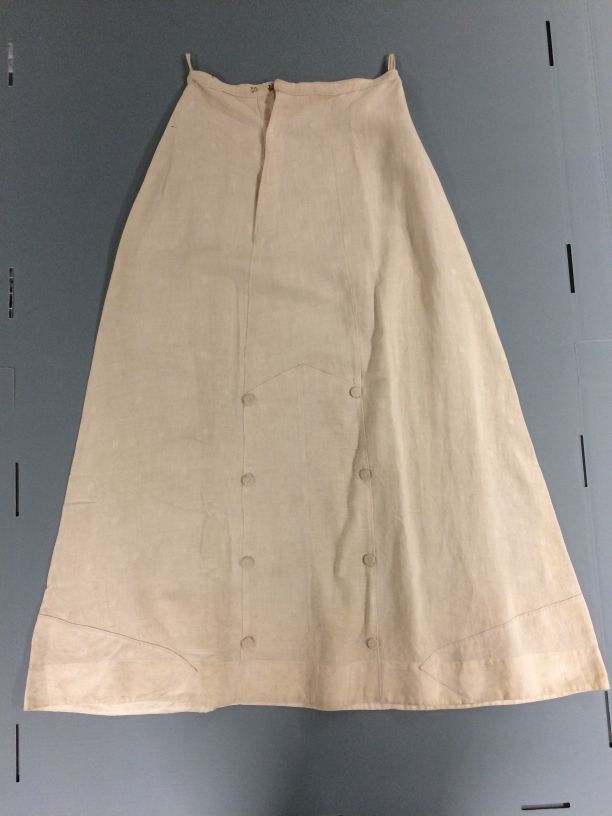 Zomerrok van wit linnen met ingeweven ajourmotiefjes en ingenaaid paneel versierd met acht knopen