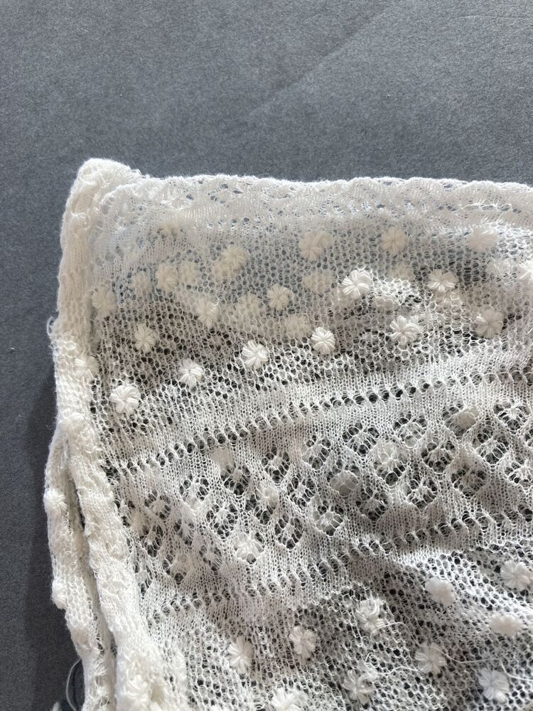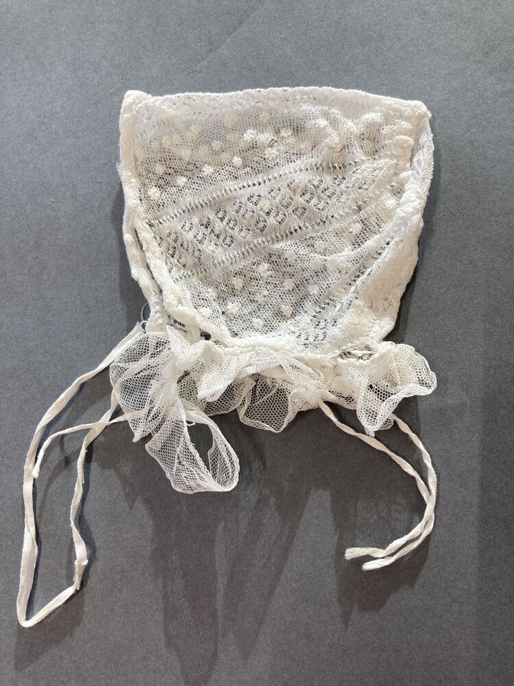 Kindermuts van zeer fijn machinaal ajourbreiwerk met borduurwerk, rond geborduurd tule bolletje, effen tule rimpelstrook langs onderkant